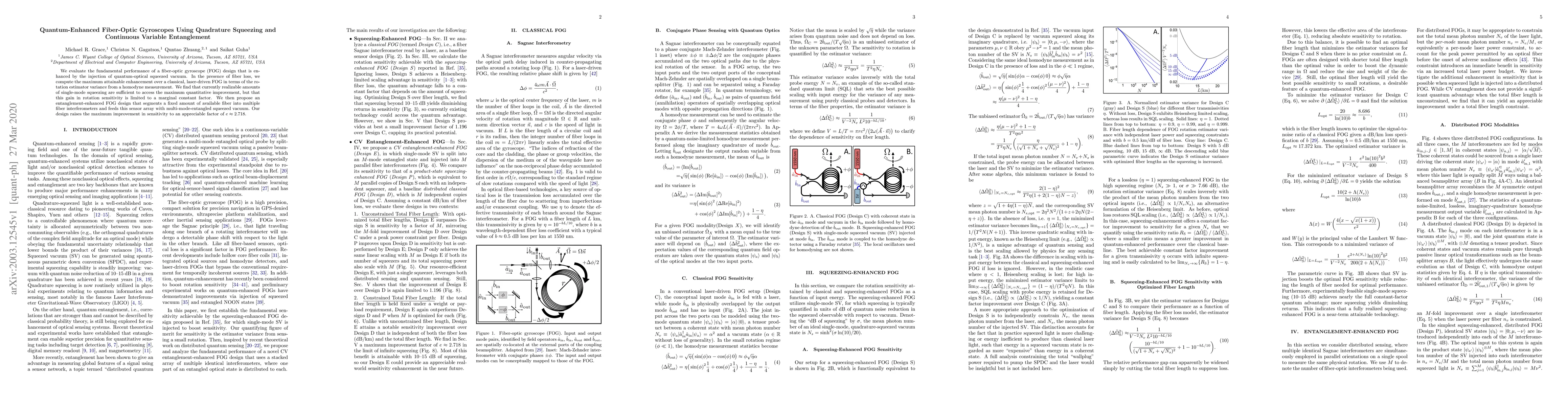 This paper investigates quantum-enhanced fiber-optic gyroscopes utilizing squeezed vacuum and continuous variable entanglement. It demonstrates that while increased squeezing improves angular velocity estimation, beyond 10-15 dB, further gains diminish. The study also shows that segmenting the fiber into multiple interferometers with entangled squeezed vacuum enhances rotation estimation by a factor of e.