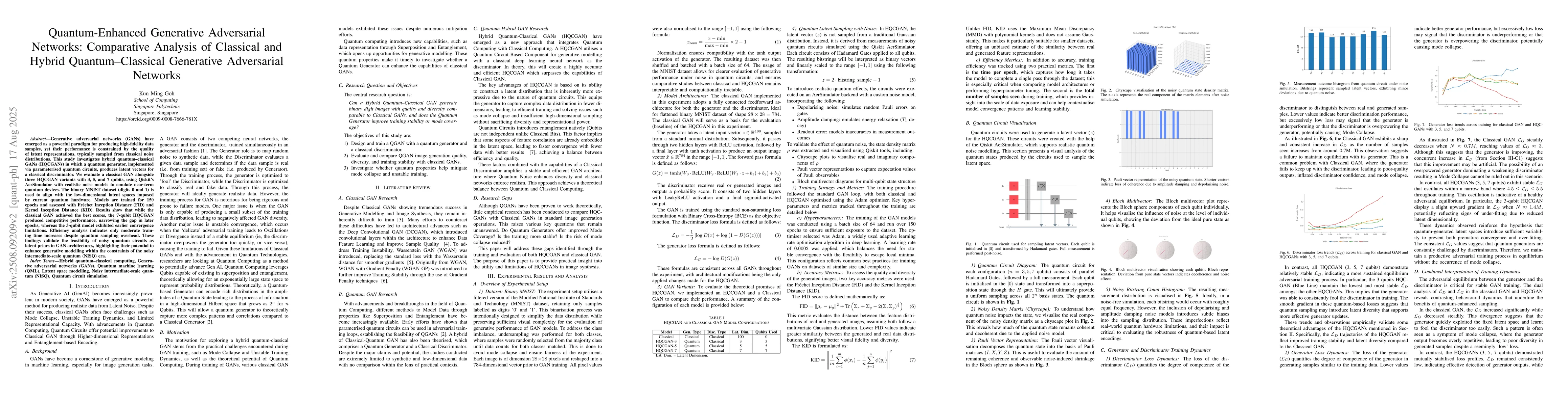 Generative adversarial networks (GANs) have emerged as a powerful paradigm for producing high-fidelity data samples, yet their performance is constrained by the quality of latent representations, typically sampled from classical noise distributions. This study investigates hybrid quantum-classical GANs (HQCGANs) in which a quantum generator, implemented via parameterised quantum circuits, produces latent vectors for a classical discriminator. We evaluate a classical GAN alongside three HQCGAN variants with 3, 5, and 7 qubits, using Qiskit's AerSimulator with realistic noise models to emulate near-term quantum devices. The binary MNIST dataset (digits 0 and 1) is used to align with the low-dimensional latent spaces imposed by current quantum hardware. Models are trained for 150 epochs and assessed with Frechet Inception Distance (FID) and Kernel Inception Distance (KID). Results show that while the classical GAN achieved the best scores, the 7-qubit HQCGAN produced competitive performance, narrowing the gap in later epochs, whereas the 3-qubit model exhibited earlier convergence limitations. Efficiency analysis indicates only moderate training time increases despite quantum sampling overhead. These findings validate the feasibility of noisy quantum circuits as latent priors in GAN architectures, highlighting their potential to enhance generative modelling within the constraints of the noisy intermediate-scale quantum (NISQ) era.