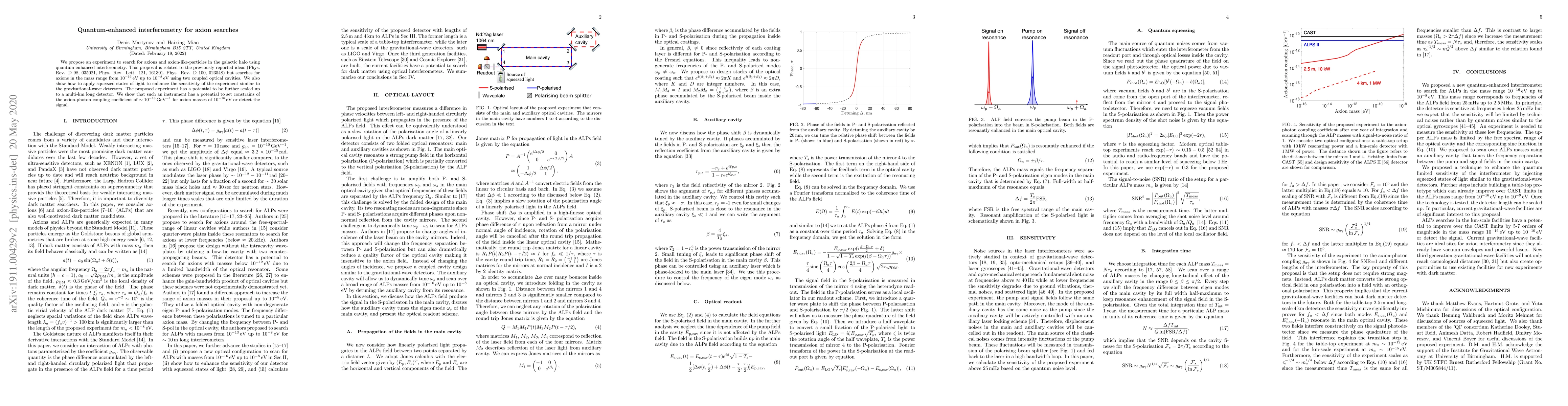 We propose an experiment to search for axions and axion-like-particles in the galactic halo using quantum-enhanced interferometry. This proposal is related to the previously reported ideas (Phys. Rev. D 98, 035021, Phys. Rev. Lett. 121, 161301, Phys. Rev. D 100, 023548) but searches for axions in the mass range from $10^{-16}$ eV up to $10^{-8}$ eV using two coupled optical cavities. We also show how to apply squeezed states of light to enhance the sensitivity of the experiment similar to the gravitational-wave detectors. The proposed experiment has a potential to be further scaled up to a multi-km long detector. We show that such an instrument has a potential to set constrains of the axion-photon coupling coefficient of $\sim 10^{-18}$ GeV$^{-1}$ for axion masses of $10^{-16}$ eV or detect the signal.