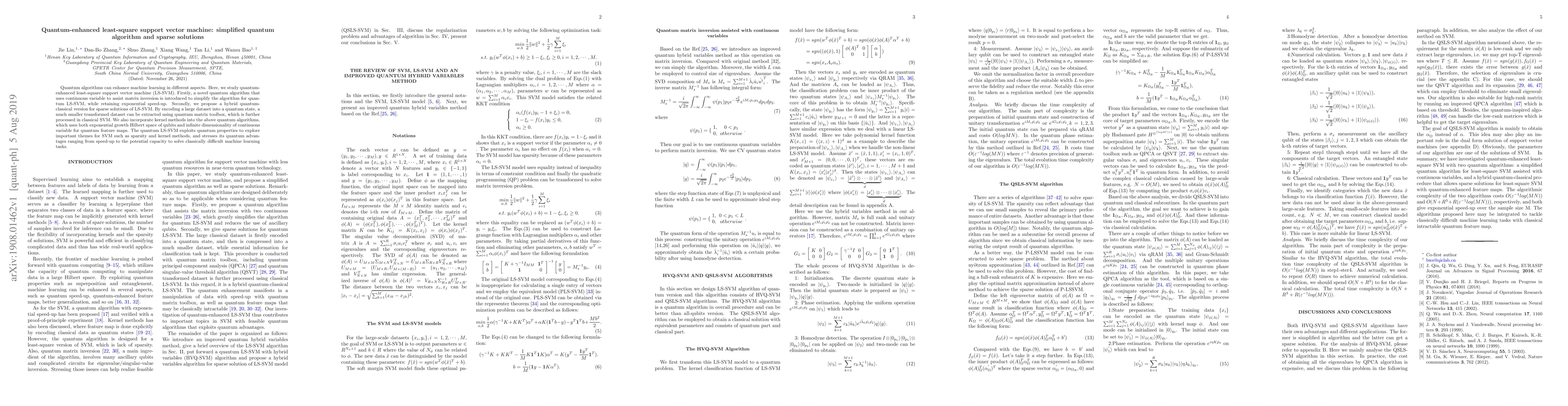 This paper introduces a quantum-enhanced least-square support vector machine (LS-SVM) algorithm that leverages quantum computing for improved efficiency and sparse solutions. It proposes a simplified quantum algorithm using continuous variables for matrix inversion and a hybrid quantum-classical approach for sparse data processing, incorporating kernel methods to exploit quantum properties for machine learning tasks.