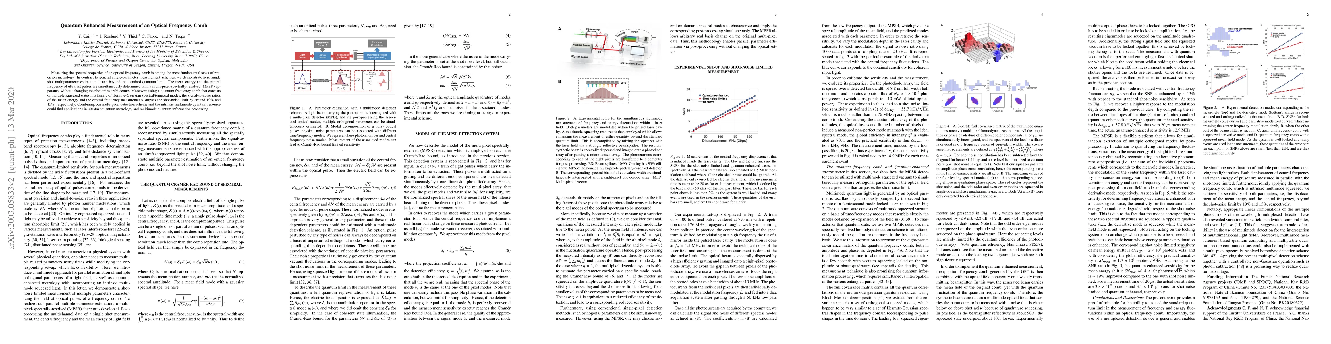 This paper demonstrates quantum-enhanced measurement of an optical frequency comb, achieving single-shot multiparameter estimation surpassing the standard quantum limit. Utilizing a multi-pixel-spectrally-resolved apparatus and a quantum frequency comb of squeezed states, it improves the signal-to-noise ratio for mean energy and central frequency measurements by 19% and 15% respectively, with potential applications in ultrafast quantum metrology.