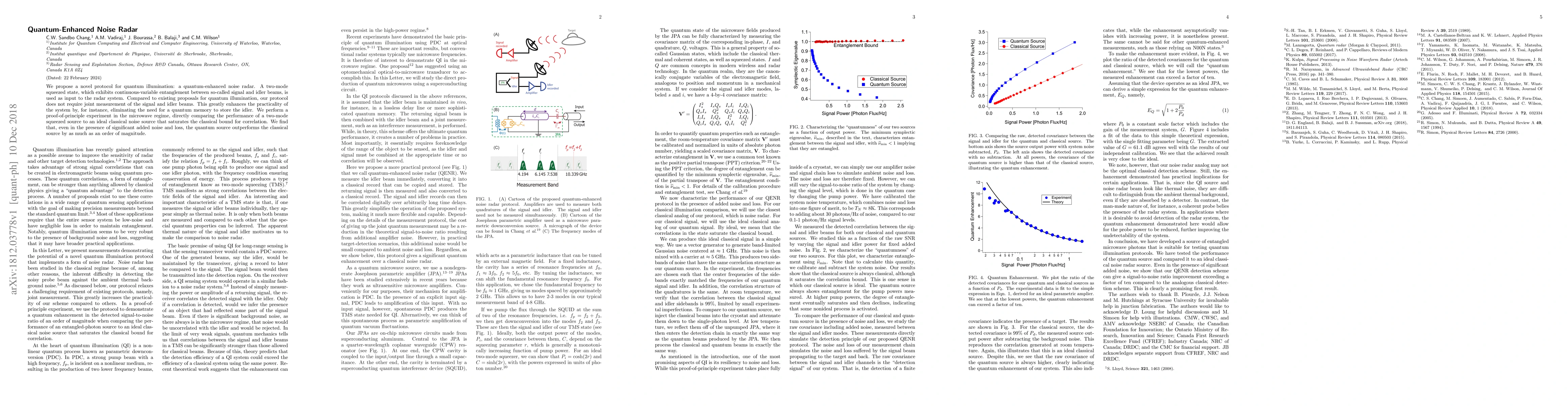We propose a novel protocol for quantum illumination: a quantum-enhanced noise radar. A two-mode squeezed state, which exhibits continuous-variable entanglement between so-called signal and idler beams, is used as input to the radar system. Compared to existing proposals for quantum illumination, our protocol does not require joint measurement of the signal and idler beams. This greatly enhances the practicality of the system by, for instance, eliminating the need for a quantum memory to store the idler. We perform a proof-of-principle experiment in the microwave regime, directly comparing the performance of a two-mode squeezed source to an ideal classical noise source that saturates the classical bound for correlation. We find that, even in the presence of significant added noise and loss, the quantum source outperforms the classical source by as much as an order of magnitude.