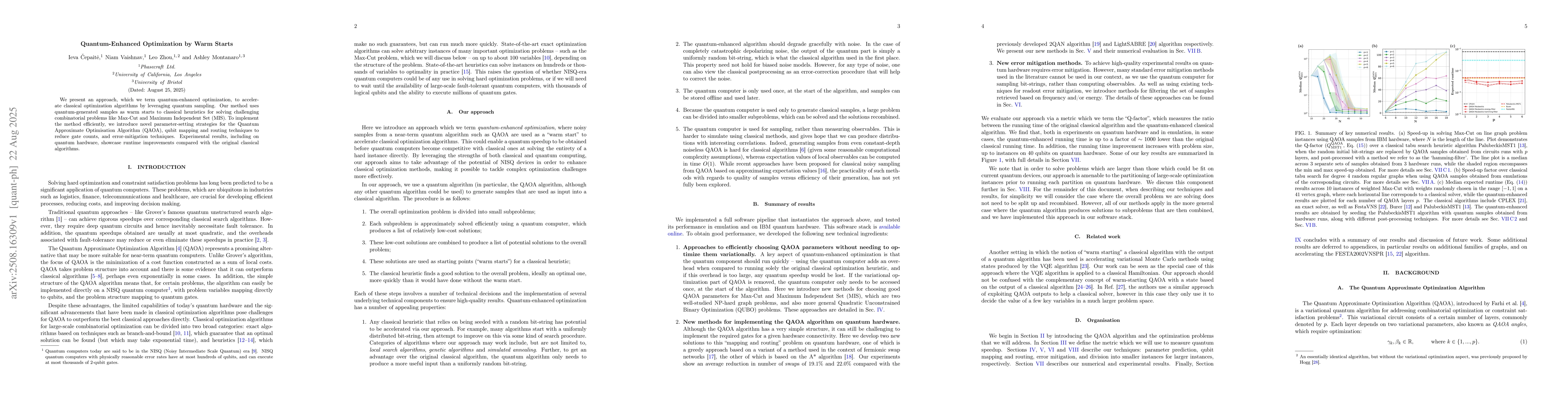 We present an approach, which we term quantum-enhanced optimization, to accelerate classical optimization algorithms by leveraging quantum sampling. Our method uses quantum-generated samples as warm starts to classical heuristics for solving challenging combinatorial problems like Max-Cut and Maximum Independent Set (MIS). To implement the method efficiently, we introduce novel parameter-setting strategies for the Quantum Approximate Optimization Algorithm (QAOA), qubit mapping and routing techniques to reduce gate counts, and error-mitigation techniques. Experimental results, including on quantum hardware, showcase runtime improvements compared with the original classical algorithms.