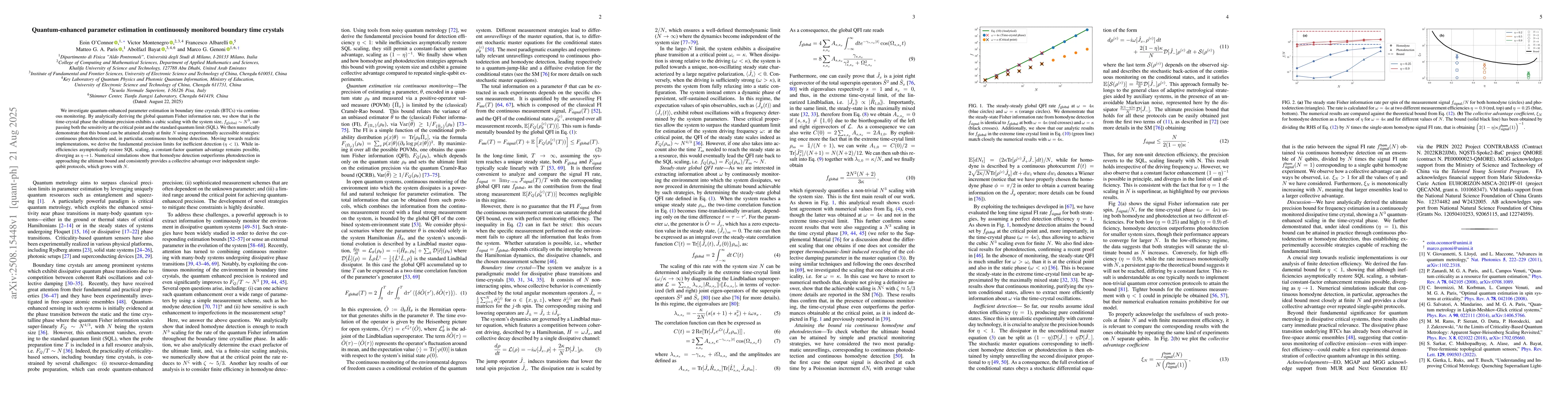 We investigate quantum-enhanced parameter estimation in boundary time crystals (BTCs) via continuous monitoring. By analytically deriving the global quantum Fisher information rate, we show that in the time-crystal phase the ultimate precision exhibits a cubic scaling with the system size, $f_{\mathrm{global}}\sim N^3$, surpassing both the sensitivity at the critical point and the standard quantum limit (SQL). We then numerically demonstrate that this bound can be attained already at finite $N$ using experimentally accessible strategies: continuous photodetection and, in particular, continuous homodyne detection. Moving towards realistic implementations, we derive the fundamental precision limits for inefficient detection ($\eta<1$). While inefficiencies asymptotically restore SQL scaling, a constant-factor quantum advantage remains possible, diverging as $\eta\!\to\!1$. Numerical simulations show that homodyne detection outperforms photodetection in approaching the ultimate bound and consistently provides a collective advantage over independent single-qubit protocols, which grows with $N$.