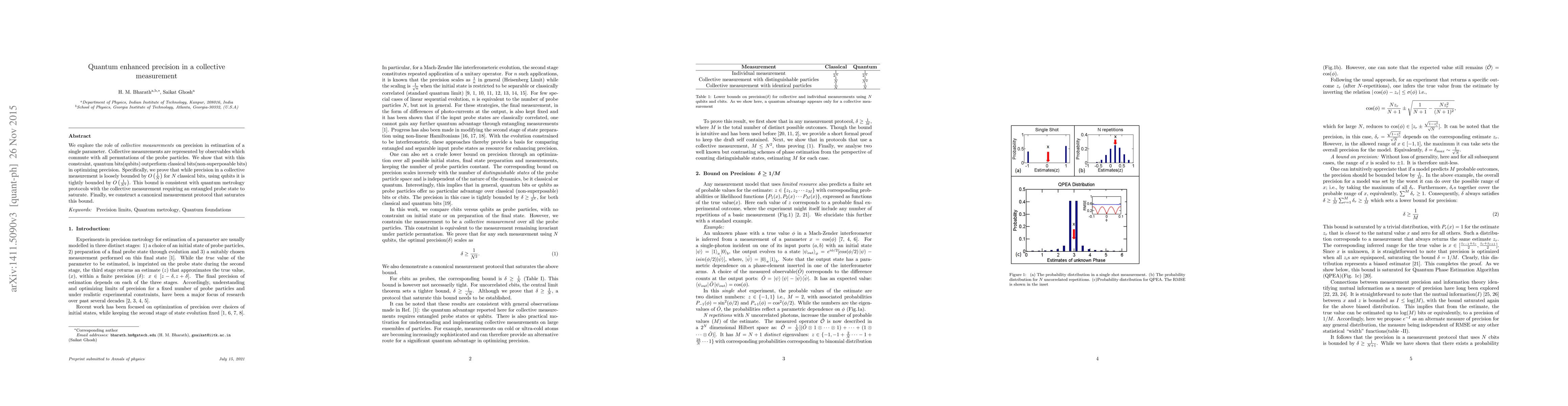 We explore the role of $\textit{collective measurements}$ on precision in estimation of a single parameter. Collective measurements are represented by observables which commute with all permutations of the probe particles. We show that with this constraint, quantum bits(qubits) outperform classical bits(non-superposable bits) in optimizing precision. Specifically, we prove that while precision in a collective measurement is loosely bounded by $O\left(\frac{1}{N}\right)$ for $N$ classical bits, using qubits it is tightly bounded by $O\left(\frac{1}{N^2}\right)$. This bound is consistent with quantum metrology protocols with the collective measurement requiring an entangled probe state to saturate. Finally, we construct a canonical measurement protocol that saturates this bound.