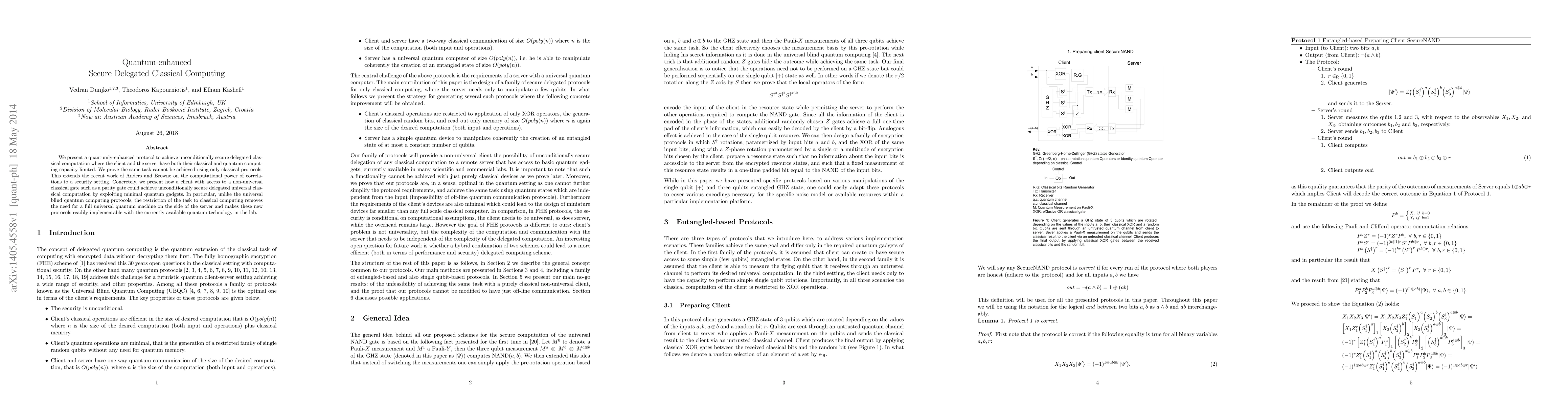 This paper introduces a quantum-enhanced protocol for secure delegated classical computation, proving that such security cannot be achieved with classical means alone. The protocol allows a client with limited resources to perform secure universal classical computation using minimal quantum gadgets, making it feasible with current quantum technology.