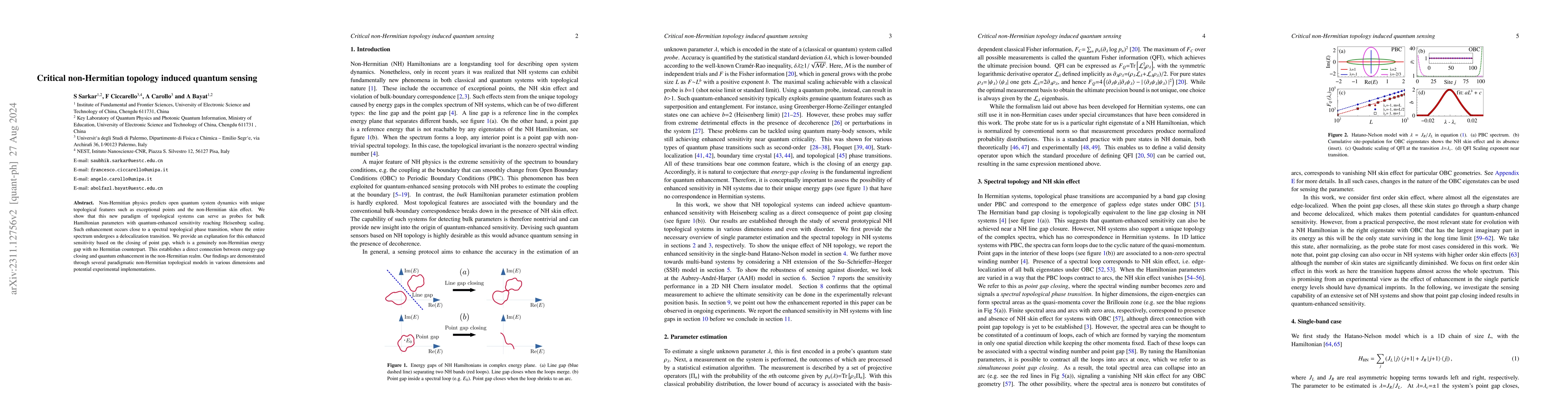 This paper demonstrates that non-Hermitian topological systems can achieve quantum-enhanced sensing with Heisenberg scaling sensitivity, particularly near spectral topological phase transitions. The enhanced sensitivity is linked to the closing of a non-Hermitian energy gap, establishing a direct connection between energy-gap closing and quantum enhancement in non-Hermitian systems.