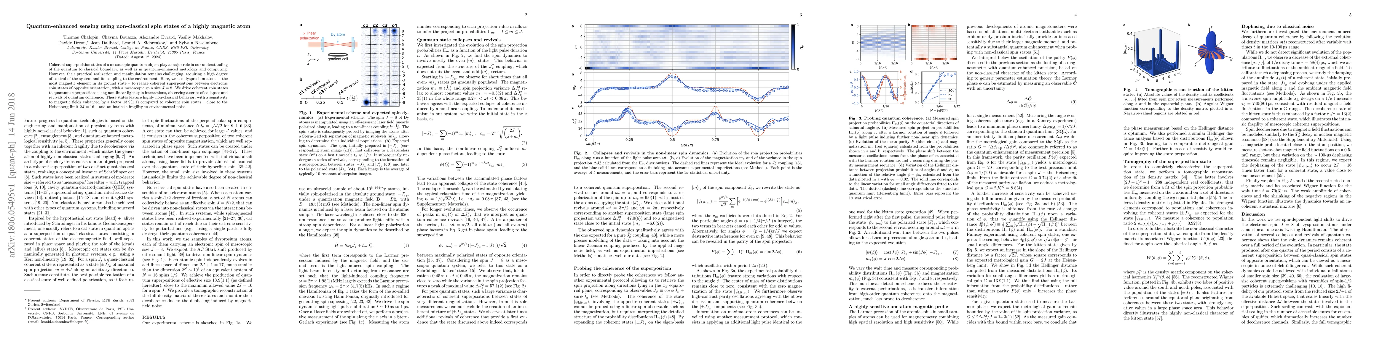 Coherent superposition states of a mesoscopic quantum object play a major role in our understanding of the quantum to classical boundary, as well as in quantum-enhanced metrology and computing. However, their practical realization and manipulation remains challenging, requiring a high degree of control of the system and its coupling to the environment. Here, we use dysprosium atoms - the most magnetic element in its ground state - to realize coherent superpositions between electronic spin states of opposite orientation, with a mesoscopic spin size J=8. We drive coherent spin states to quantum superpositions using non-linear light-spin interactions, observing a series of collapses and revivals of quantum coherence. These states feature highly non-classical behavior, with a sensitivity to magnetic fields enhanced by a factor 13.9(1.1) compared to coherent spin states - close to the Heisenberg limit 2J=16 - and an intrinsic fragility to environmental noise.