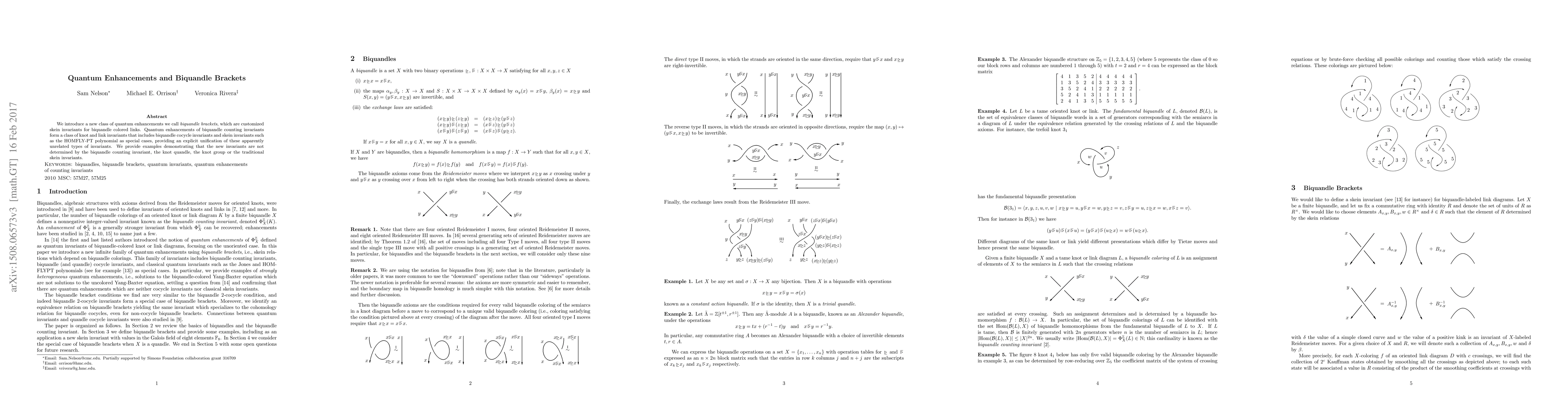This paper introduces biquandle brackets as a novel class of quantum enhancements, unifying various knot and link invariants like biquandle cocycle invariants and HOMFLY-PT polynomials. The study demonstrates that these new invariants are distinct from traditional knot invariants and skein invariants.