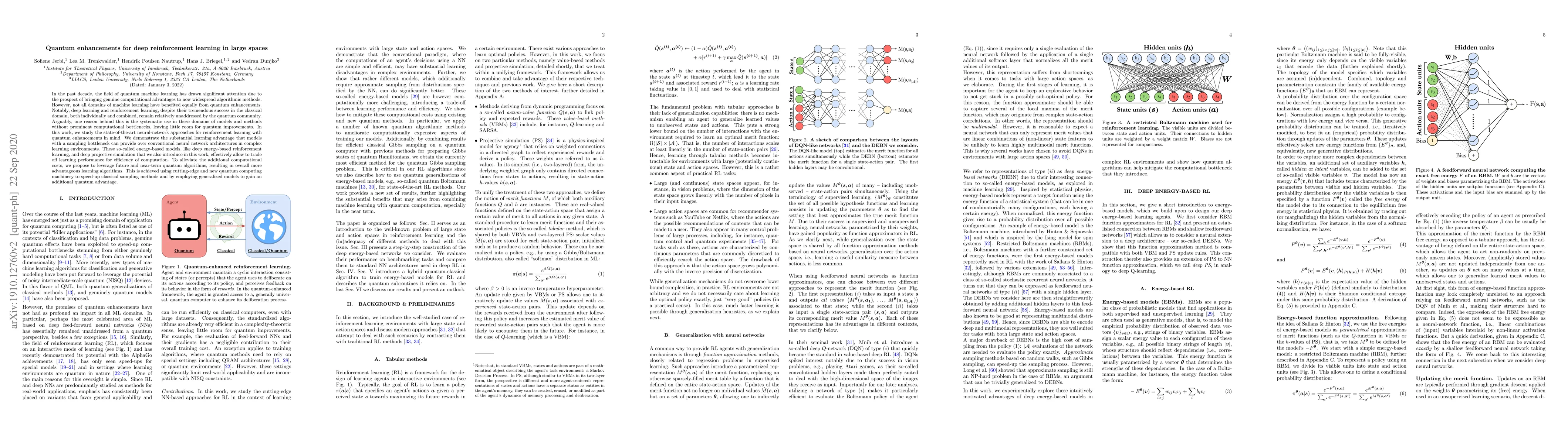 In the past decade, the field of quantum machine learning has drawn significant attention due to the prospect of bringing genuine computational advantages to now widespread algorithmic methods. However, not all domains of machine learning have benefited equally from quantum enhancements. Notably, deep learning and reinforcement learning, despite their tremendous success in the classical domain, both individually and combined, remain relatively unaddressed by the quantum community. Arguably, one reason behind this is the systematic use in these domains of models and methods without prominent computational bottlenecks, leaving little room for quantum improvements. In this work, we study the state-of-the-art neural-network approaches for reinforcement learning with quantum enhancements in mind. We demonstrate the substantial learning advantage that models with a sampling bottleneck can provide over conventional neural network architectures in complex learning environments. These so-called energy-based models, like deep energy-based reinforcement learning, and deep projective simulation that we also introduce in this work, effectively allow to trade off learning performance for efficiency of computation. To alleviate the additional computational costs, we propose to leverage future and near-term quantum algorithms, resulting in overall more advantageous learning algorithms. This is achieved using cutting-edge and new quantum computing machinery to speed-up classical sampling methods and by employing generalized models to gain an additional quantum advantage.