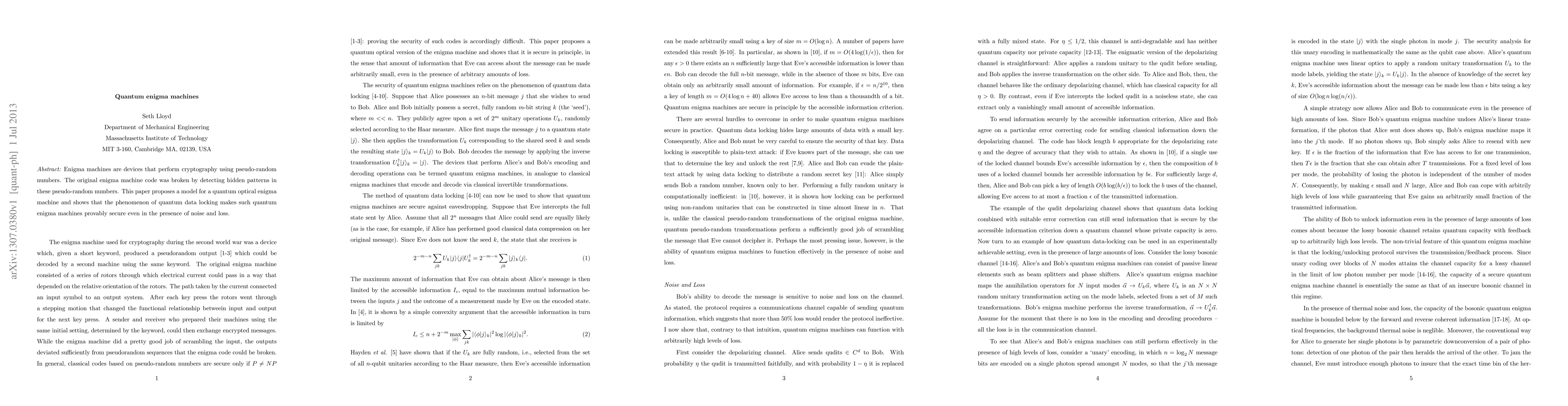 The research proposes a model for a quantum optical enigma machine and shows that the phenomenon of quantum data locking makes such machines provably secure even in the presence of noise and loss.