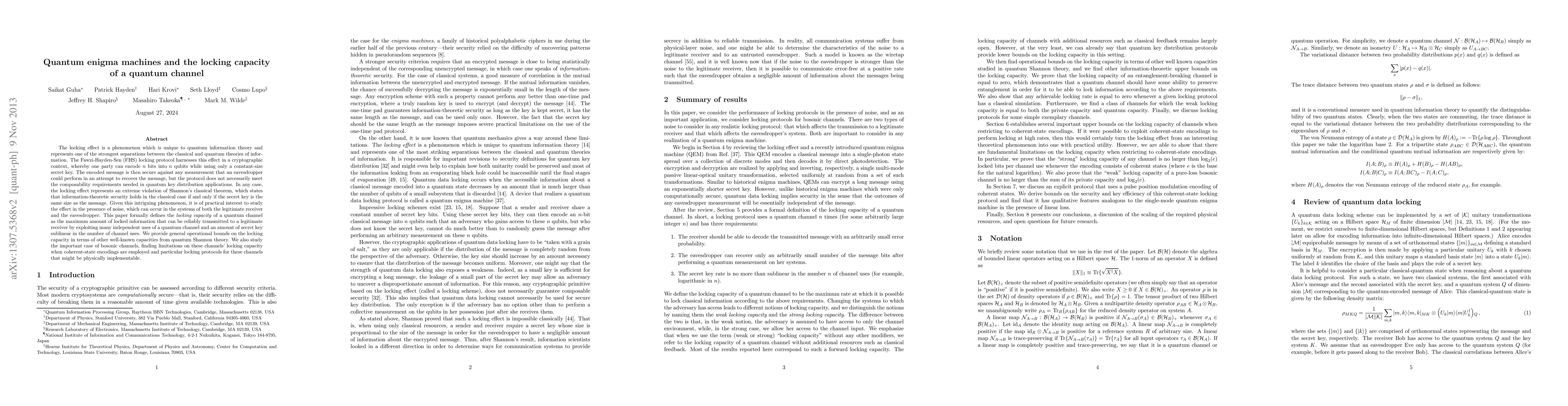 The locking effect is a phenomenon which is unique to quantum information theory and represents one of the strongest separations between the classical and quantum theories of information. The Fawzi-Hayden-Sen (FHS) locking protocol harnesses this effect in a cryptographic context, whereby one party can encode n bits into n qubits while using only a constant-size secret key. The encoded message is then secure against any measurement that an eavesdropper could perform in an attempt to recover the message, but the protocol does not necessarily meet the composability requirements needed in quantum key distribution applications. In any case, the locking effect represents an extreme violation of Shannon's classical theorem, which states that information-theoretic security holds in the classical case if and only if the secret key is the same size as the message. Given this intriguing phenomenon, it is of practical interest to study the effect in the presence of noise, which can occur in the systems of both the legitimate receiver and the eavesdropper. This paper formally defines the locking capacity of a quantum channel as the maximum amount of locked information that can be reliably transmitted to a legitimate receiver by exploiting many independent uses of a quantum channel and an amount of secret key sublinear in the number of channel uses. We provide general operational bounds on the locking capacity in terms of other well-known capacities from quantum Shannon theory. We also study the important case of bosonic channels, finding limitations on these channels' locking capacity when coherent-state encodings are employed and particular locking protocols for these channels that might be physically implementable.