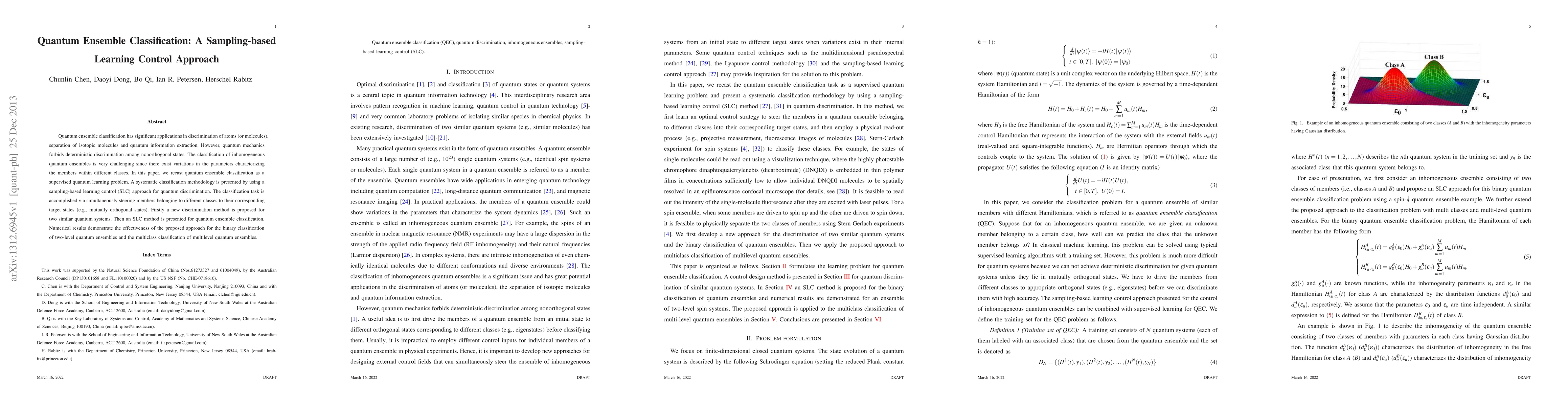 This paper proposes a sampling-based learning control (SLC) approach for quantum ensemble classification, addressing the challenge of discriminating nonorthogonal quantum states. The method steers quantum states to target states for effective classification, demonstrating success in binary and multiclass scenarios.