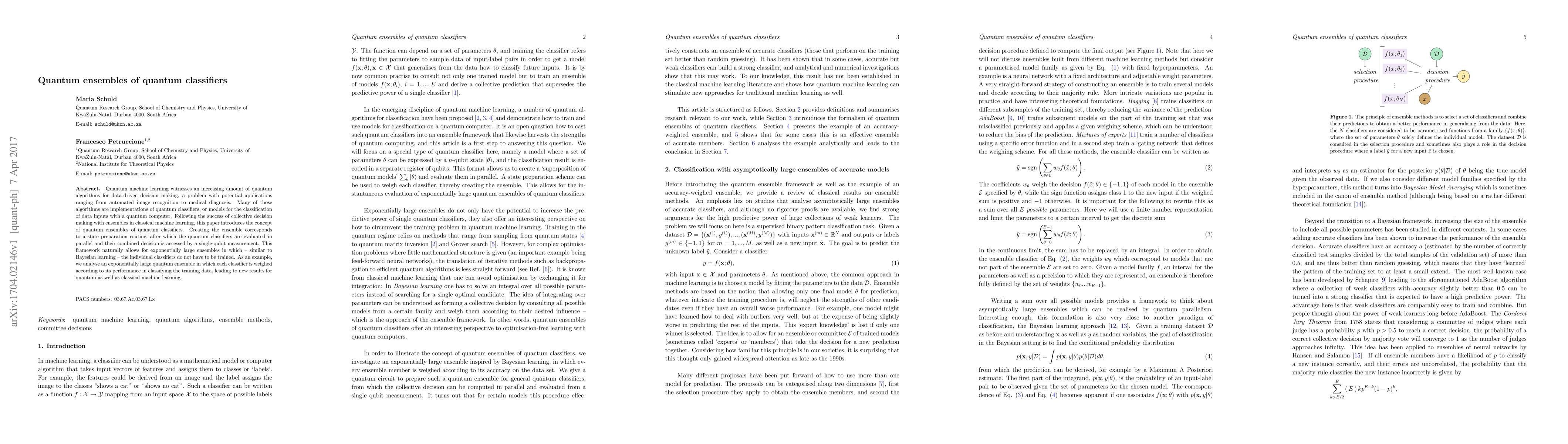 This paper introduces quantum ensembles of quantum classifiers, leveraging quantum machine learning for data classification. It proposes a framework where multiple quantum classifiers are evaluated in parallel, and their combined decision is made via a single-qubit measurement, allowing for exponentially large ensembles without the need for individual classifier training.