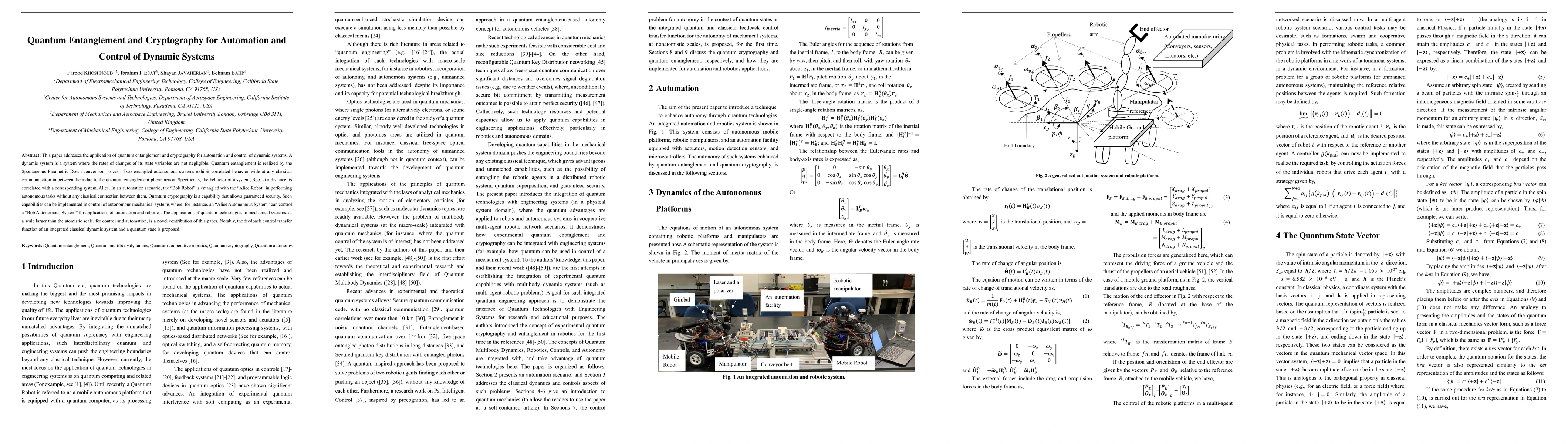 This paper addresses the application of quantum entanglement and cryptography for automation and control of dynamic systems. A dynamic system is a system where the rates of changes of its state variables are not negligible. Quantum entanglement is realized by the Spontaneous Parametric Down-conversion process. Two entangled autonomous systems exhibit correlated behavior without any classical communication in between them due to the quantum entanglement phenomenon. Specifically, the behavior of a system, Bob, at a distance, is correlated with a corresponding system, Alice. In an automation scenario, the 'Bob Robot' is entangled with the 'Alice Robot' in performing autonomous tasks without any classical connection between them. Quantum cryptography is a capability that allows guaranteed security. Such capabilities can be implemented in control of autonomous mechanical systems where, for instance, an 'Alice Autonomous System' can control a 'Bob Autonomous System' for applications of automation and robotics. The applications of quantum technologies to mechanical systems, at a scale larger than the atomistic scale, for control and automation, is a novel contribution of this paper. Notably, the feedback control transfer function of an integrated classical dynamic system and a quantum state is proposed.