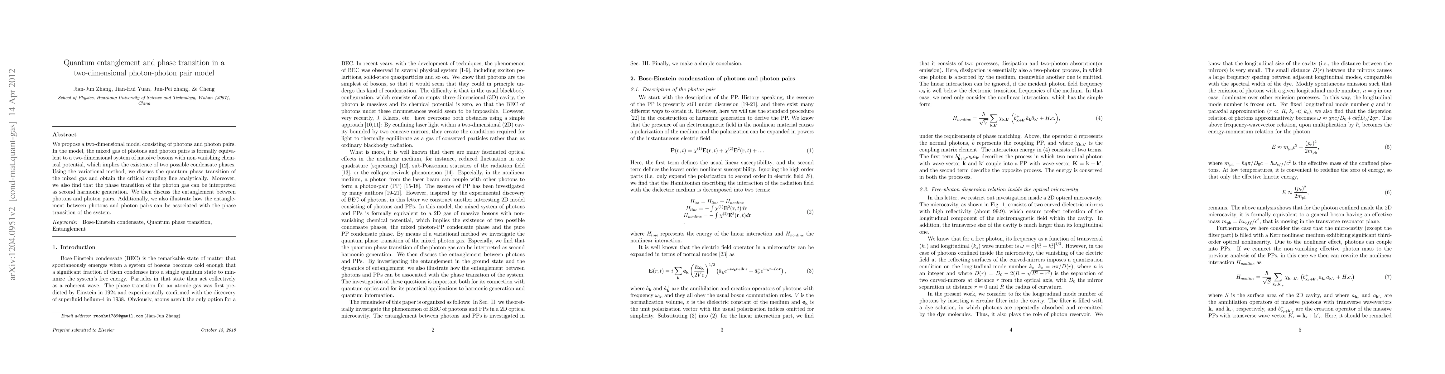 This paper proposes a two-dimensional photon-photon pair model, demonstrating a quantum phase transition and entanglement. The model's phase transition is analytically determined and linked to second harmonic generation, with entanglement between photons and photon pairs tied to the system's phase transition.