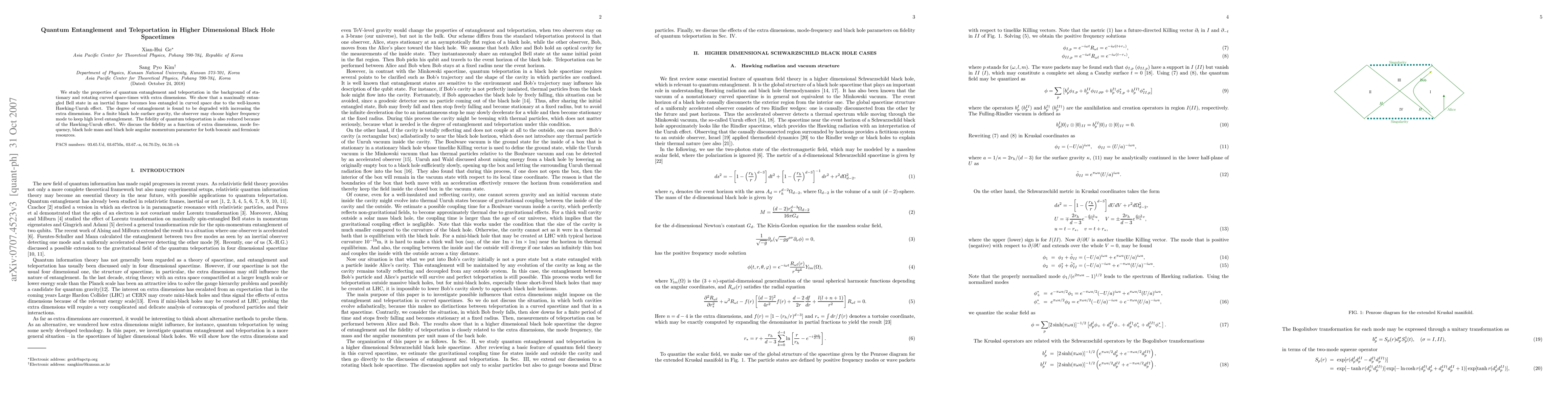 We study the properties of quantum entanglement and teleportation in the background of stationary and rotating curved space-times with extra dimensions. We show that a maximally entangled Bell state in an inertial frame becomes less entangled in curved space due to the well-known Hawking-Unruh effect. The degree of entanglement is found to be degraded with increasing the extra dimensions. For a finite black hole surface gravity, the observer may choose higher frequency mode to keep high level entanglement. The fidelity of quantum teleporation is also reduced because of the Hawking-Unruh effect. We discuss the fidelity as a function of extra dimensions, mode frequency, black hole mass and black hole angular momentum parameter for both bosonic and fermionic resources.