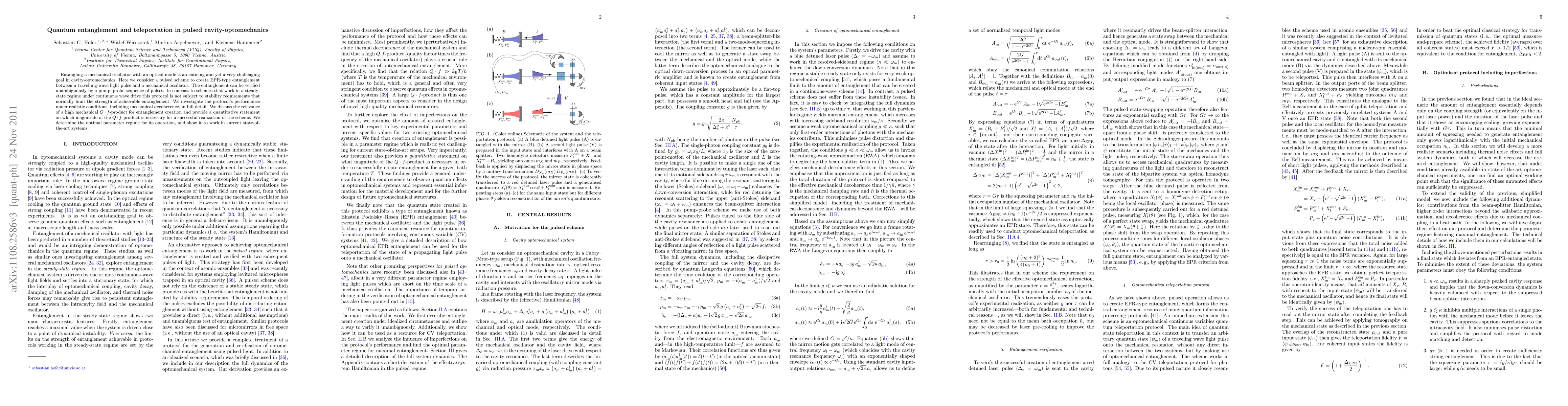 This paper proposes a pulsed scheme for creating quantum entanglement between a mechanical oscillator and an optical mode in cavity optomechanics, demonstrating a method that avoids stability limitations of continuous-wave drives. The protocol's performance is analyzed under realistic conditions, highlighting the necessity of a high mechanical Qf product for successful entanglement.