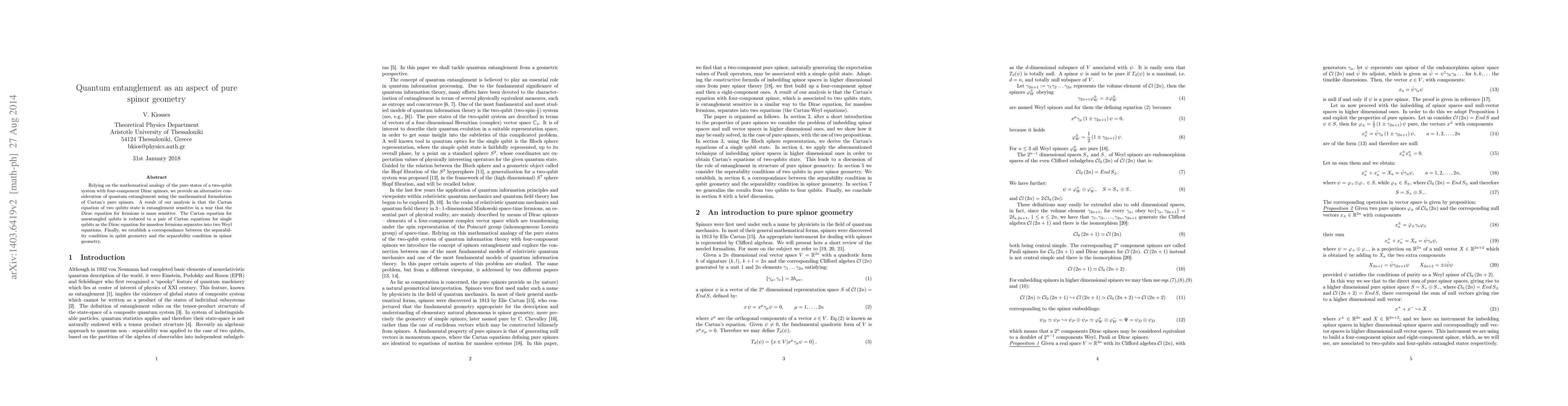 Relying on the mathematical analogy of the pure states of a two-qubit system with four-component Dirac spinors, we provide an alternative consideration of quantum entanglement using the mathematical formulation of Cartan's pure spinors. A result of our analysis is that the Cartan equation of two qubits state is entanglement sensitive in a way that the Dirac equation for fermions is mass sensitive. The Cartan equation for unentangled qubits is reduced to a pair of Cartan equations for single qubits as the Dirac equation for massless fermions separates into two Weyl equations. Finally, we establish a correspondance between the separability condition in qubit geometry and the separability condition in spinor geometry.