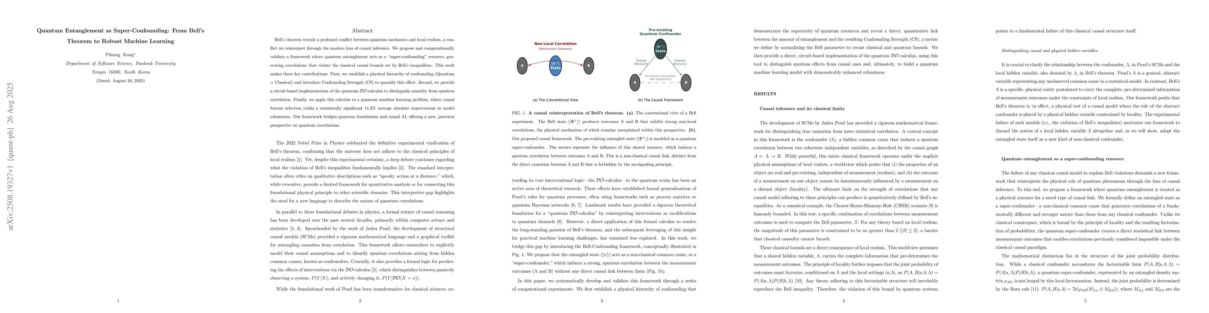 Bell's theorem reveals a profound conflict between quantum mechanics and local realism, a conflict we reinterpret through the modern lens of causal inference. We propose and computationally validate a framework where quantum entanglement acts as a "super-confounding" resource, generating correlations that violate the classical causal bounds set by Bell's inequalities. This work makes three key contributions: First, we establish a physical hierarchy of confounding (Quantum > Classical) and introduce Confounding Strength (CS) to quantify this effect. Second, we provide a circuit-based implementation of the quantum $\mathcal{DO}$-calculus to distinguish causality from spurious correlation. Finally, we apply this calculus to a quantum machine learning problem, where causal feature selection yields a statistically significant 11.3% average absolute improvement in model robustness. Our framework bridges quantum foundations and causal AI, offering a new, practical perspective on quantum correlations.
