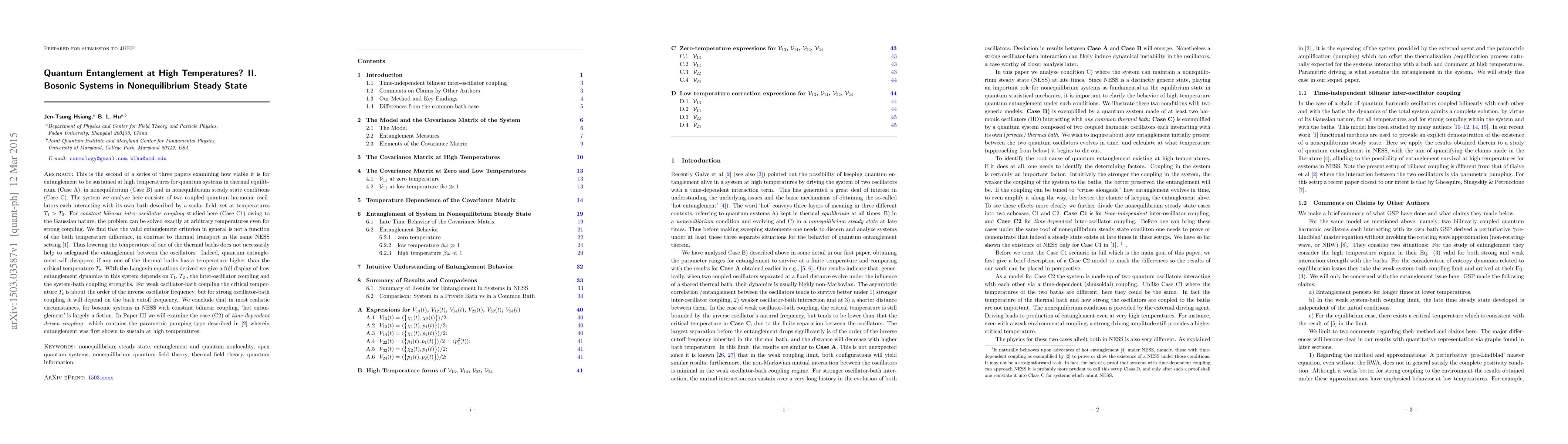 This is the second of a series of three papers examining how viable it is for entanglement to be sustained at high temperatures for quantum systems in thermal equilibrium (Case A), in nonequilibrium (Case B) and in nonequilibrium steady state conditions (Case C). The system we analyze here consists of two coupled quantum harmonic oscillators each interacting with its own bath described by a scalar field, set at temperatures $T_1 > T_2$. For \textit{constant bilinear inter-oscillator coupling} studied here (Case C1) owing to the Gaussian nature, the problem can be solved exactly at arbitrary temperatures even for strong coupling. We find that the valid entanglement criterion in general is not a function of the bath temperature difference, in contrast to thermal transport in the same NESS setting [1]. Thus lowering the temperature of one of the thermal baths does not necessarily help to safeguard the entanglement between the oscillators. Indeed, quantum entanglement will disappear if any one of the thermal baths has a temperature higher than the critical temperature $T_c$. With the Langevin equations derived we give a full display of how entanglement dynamics in this system depends on $T_{1}$, $T_{2}$ , the inter-oscillator coupling and the system-bath coupling strengths. For weak oscillator-bath coupling the critical temperature $T_c$ is about the order of the inverse oscillator frequency, but for strong oscillator-bath coupling it will depend on the bath cutoff frequency. We conclude that in most realistic circumstances, for bosonic systems in NESS with constant bilinear coupling, `hot entanglement' is largely a fiction. In Paper III we will examine the case (C2) of \textit{time-dependent driven coupling } which contains the parametric pumping type described in [2] wherein entanglement was first shown to sustain at high temperatures.
