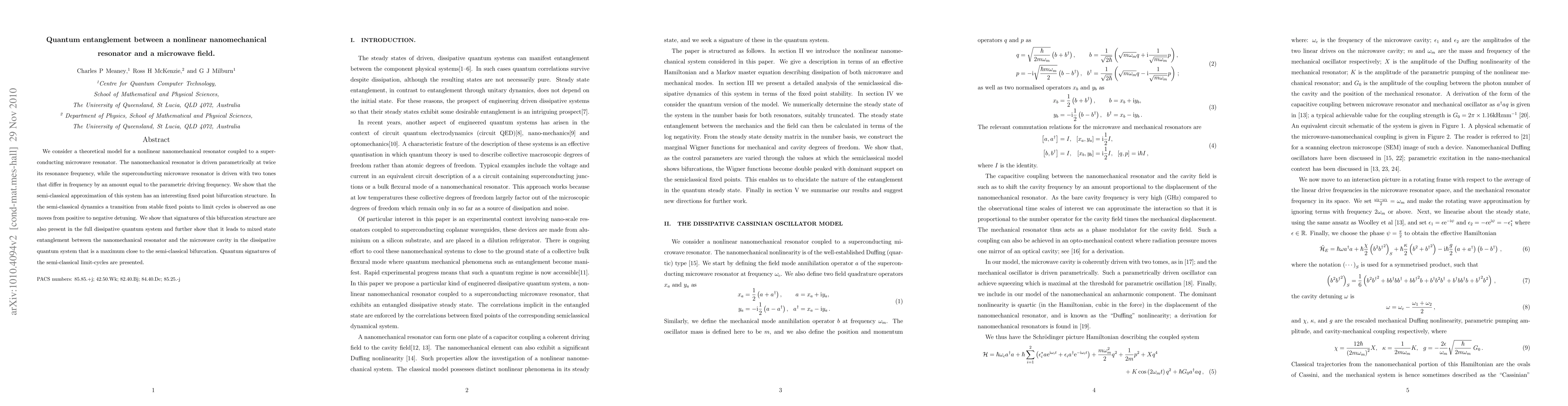 We consider a theoretical model for a nonlinear nanomechanical resonator coupled to a superconducting microwave resonator. The nanomechanical resonator is driven parametrically at twice its resonance frequency, while the superconducting microwave resonator is driven with two tones that differ in frequency by an amount equal to the parametric driving frequency. We show that the semi-classical approximation of this system has an interesting fixed point bifurcation structure. In the semi-classical dynamics a transition from stable fixed points to limit cycles is observed as one moves from positive to negative detuning. We show that signatures of this bifurcation structure are also present in the full dissipative quantum system and further show that it leads to mixed state entanglement between the nanomechanical resonator and the microwave cavity in the dissipative quantum system that is a maximum close to the semi-classical bifurcation. Quantum signatures of the semi-classical limit-cycles are presented.