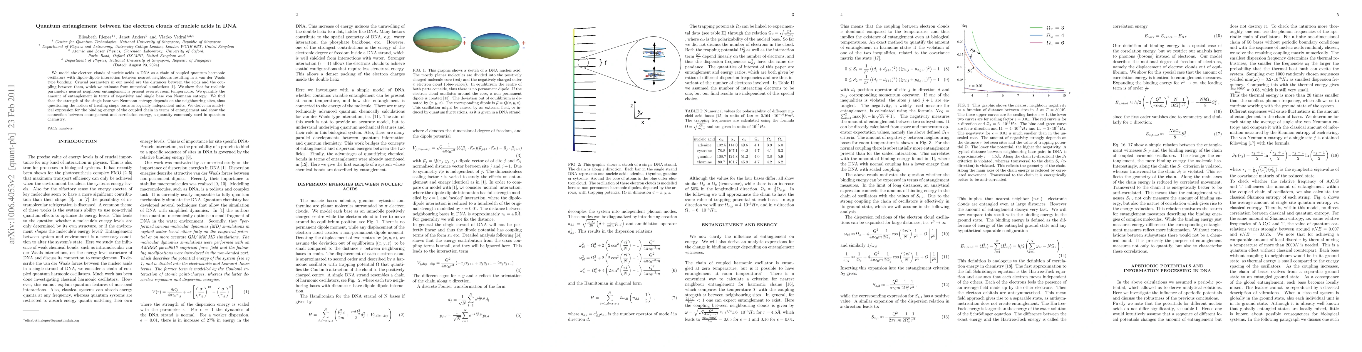 We model the electron clouds of nucleic acids in DNA as a chain of coupled quantum harmonic oscillators with dipole-dipole interaction between nearest neighbours resulting in a van der Waals type bonding. Crucial parameters in our model are the distances between the acids and the coupling between them, which we estimate from numerical simulations [1]. We show that for realistic parameters nearest neighbour entanglement is present even at room temperature. We quantify the amount of entanglement in terms of negativity and single base von Neumann entropy. We find that the strength of the single base von Neumann entropy depends on the neighbouring sites, thus questioning the notion of treating single bases as logically independent units. We derive an analytical expression for the binding energy of the coupled chain in terms of entanglement and show the connection between entanglement and correlation energy, a quantity commonly used in quantum chemistry.