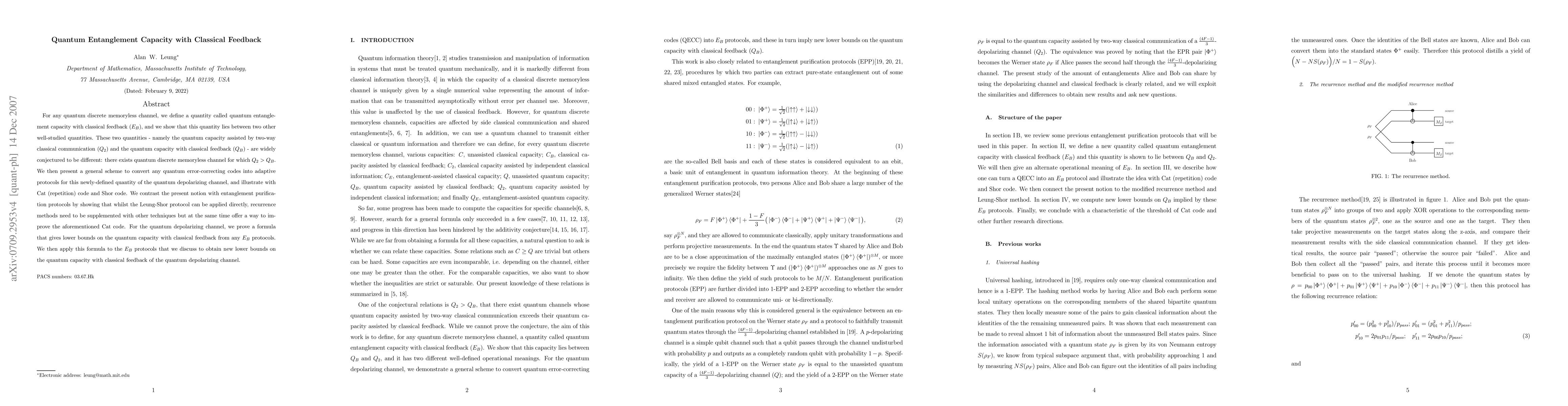 This paper introduces the concept of quantum entanglement capacity with classical feedback ($E_B$) for quantum channels, showing it lies between $Q_2$ and $Q_B$. It presents adaptive protocols for quantum error-correcting codes and provides new lower bounds on the quantum capacity with classical feedback for the quantum depolarizing channel.