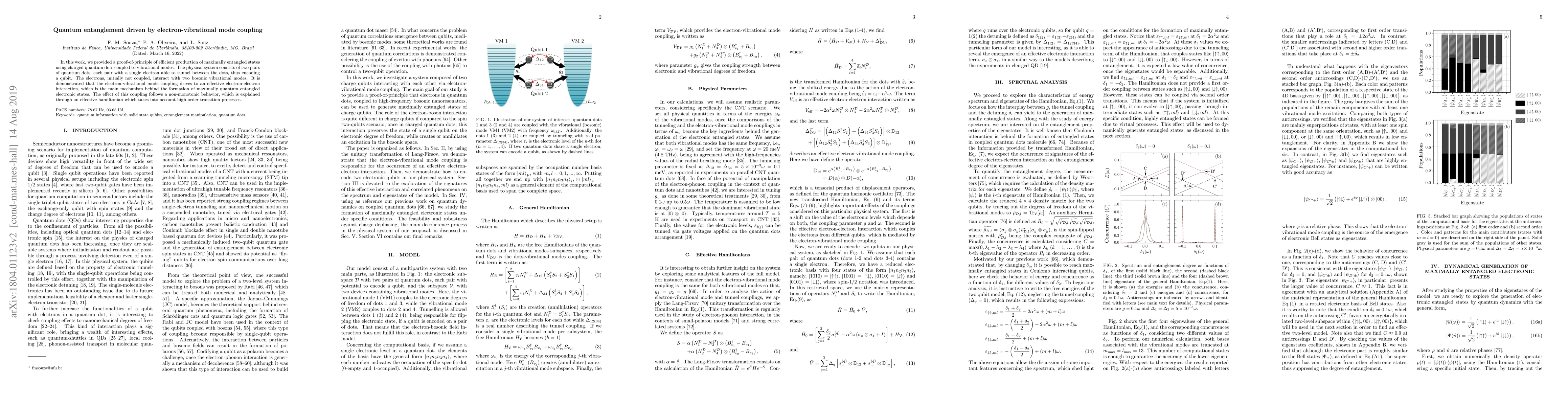 This paper demonstrates the creation of maximally entangled states via electron-vibrational mode coupling in quantum dots, showing that the interaction between electrons and vibrational modes induces an effective electron-electron interaction, leading to entanglement. The process exhibits non-monotonic behavior, explained by an effective Hamiltonian considering higher-order transitions.