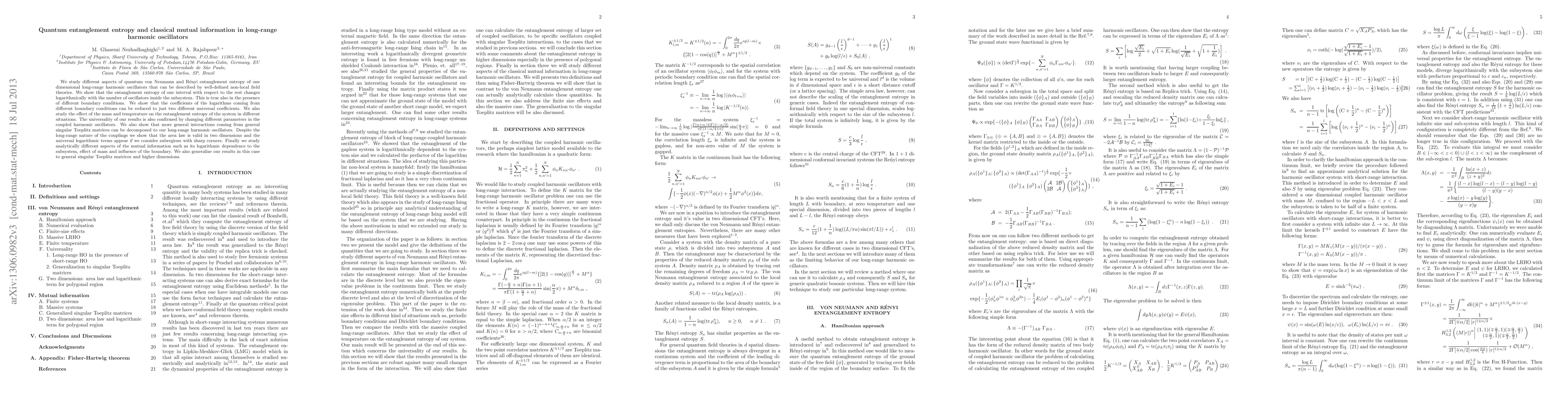 This paper investigates the entanglement entropy and mutual information in one-dimensional long-range harmonic oscillators, revealing logarithmic scaling with subsystem size and universal coefficients for different boundary conditions. It also confirms the area law's validity in two dimensions and extends findings to general singular Toeplitz matrices and higher dimensions.