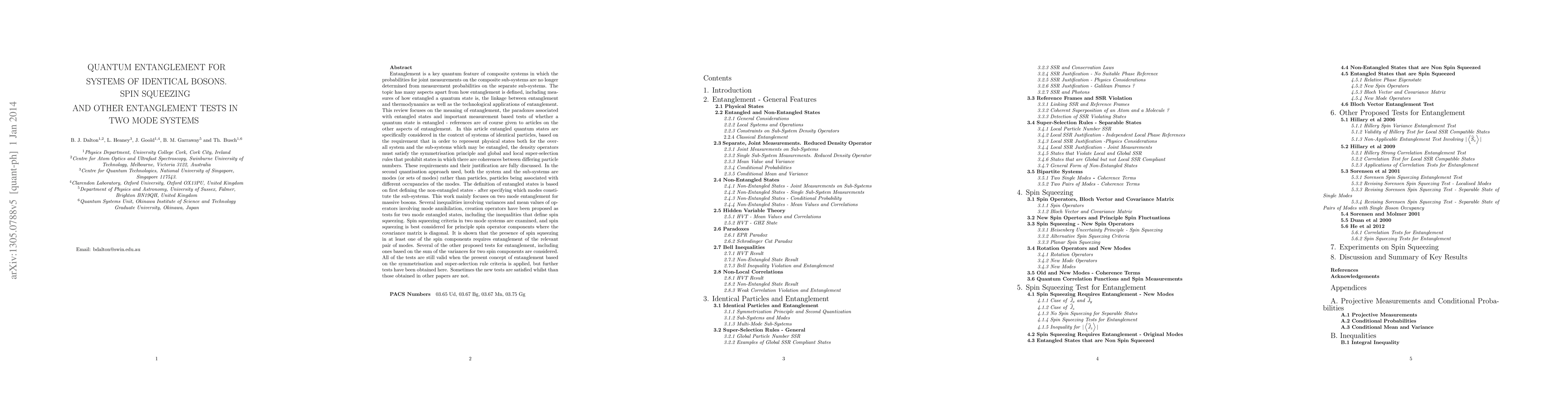 This paper explores entangled quantum states in systems of identical bosons, emphasizing symmetrisation and super-selection rules. It focuses on two-mode entanglement for massive bosons, proposing spin squeezing and other tests, showing that spin squeezing indicates entanglement, and introducing new entanglement tests that sometimes yield different results than previously proposed methods.