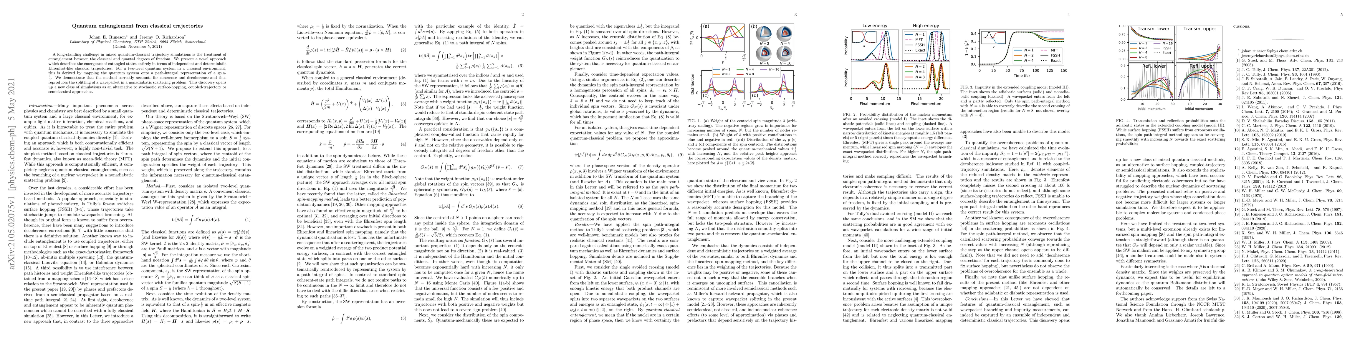 A long-standing challenge in mixed quantum-classical trajectory simulations is the treatment of entanglement between the classical and quantal degrees of freedom. We present a novel approach which describes the emergence of entangled states entirely in terms of independent and deterministic Ehrenfest-like classical trajectories. For a two-level quantum system in a classical environment, this is derived by mapping the quantum system onto a path-integral representation of a spin-1/2. We demonstrate that the method correctly accounts for coherence and decoherence and thus reproduces the splitting of a wavepacket in a nonadiabatic scattering problem. This discovery opens up a new class of simulations as an alternative to stochastic surface-hopping, coupled-trajectory or semiclassical approaches.