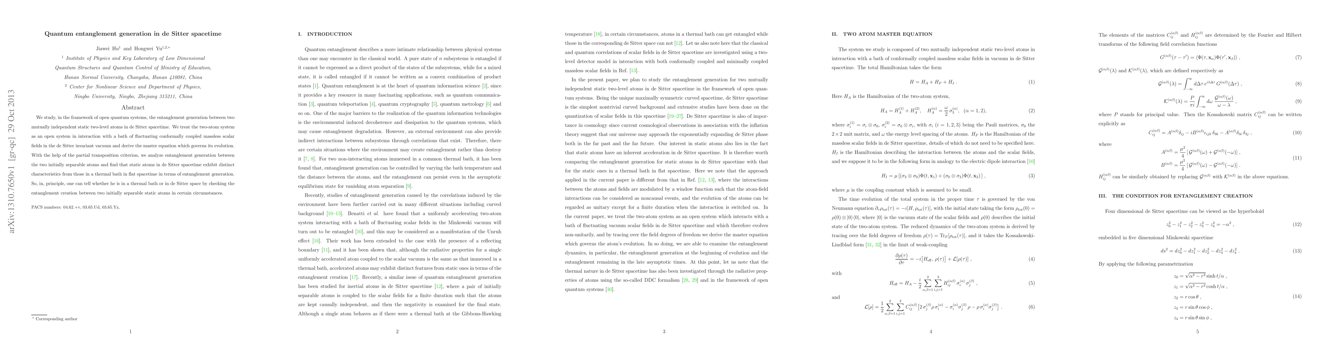 This paper investigates the generation of quantum entanglement between two independent static two-level atoms in de Sitter spacetime, modeling the system as an open quantum system interacting with conformally coupled massless scalar fields. The study reveals unique entanglement characteristics in de Sitter spacetime compared to flat spacetime, suggesting that entanglement dynamics could distinguish between these environments.