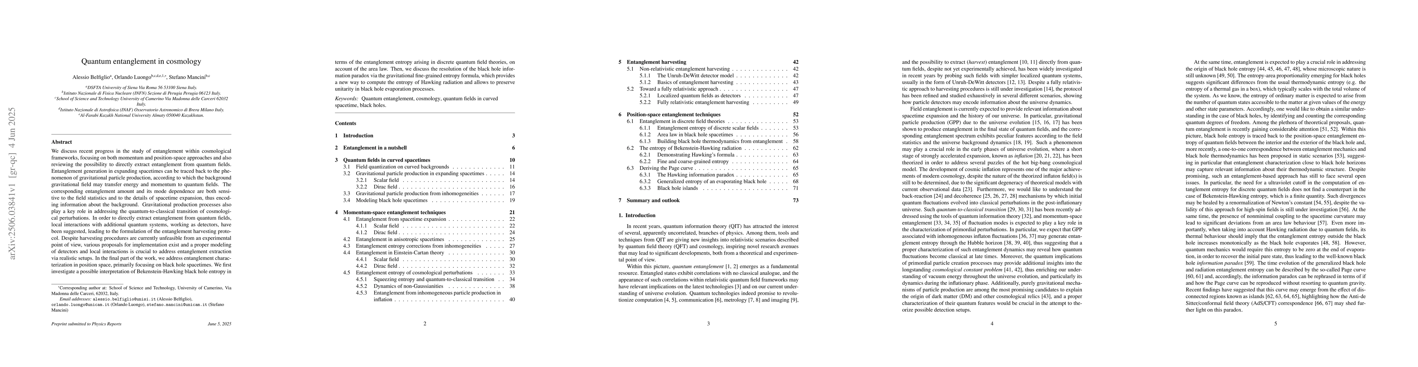 Research on quantum entanglement in cosmology reveals its connection to gravitational particle production and the potential for extracting entanglement from quantum fields. It also addresses the black hole information paradox and proposes a new way to compute entropy.