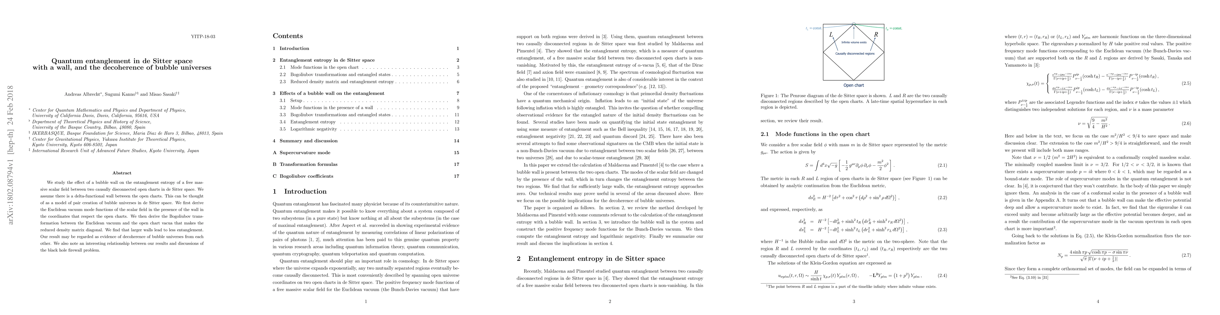 The paper investigates how a bubble wall in de Sitter space affects entanglement entropy between two open charts, finding that larger walls reduce entanglement, suggesting decoherence of bubble universes, and draws parallels to the black hole firewall problem.