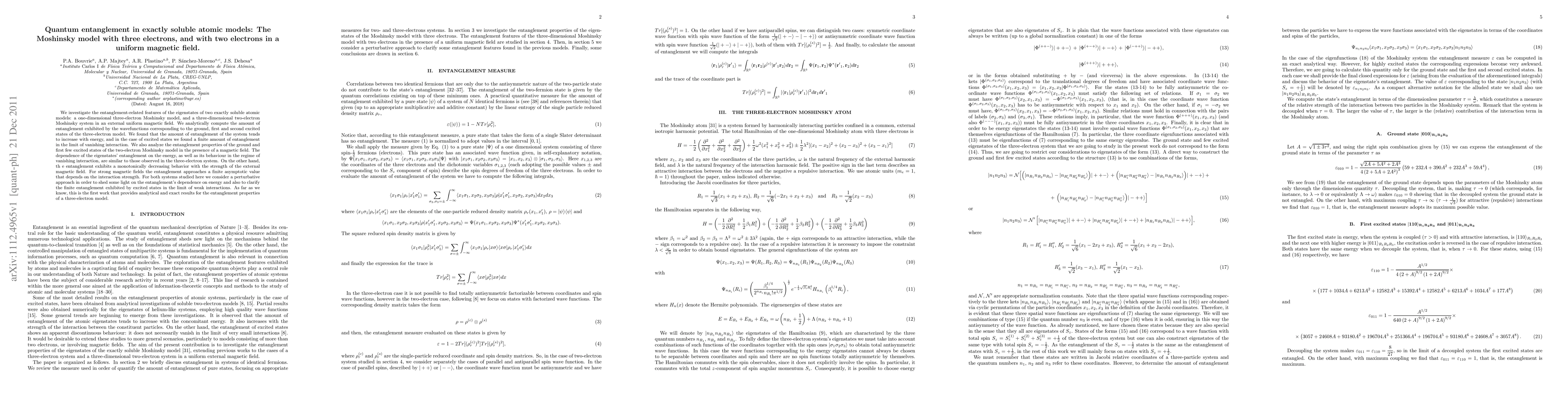 We investigate the entanglement-related features of the eigenstates of two exactly soluble atomic models: a one-dimensional three-electron Moshinsky model, and a three-dimensional two-electron Moshinsky system in an external uniform magnetic field. We analytically compute the amount of entanglement exhibited by the wavefunctions corresponding to the ground, first and second excited states of the three-electron model. We found that the amount of entanglement of the system tends to increase with energy, and in the case of excited states we found a finite amount of entanglement in the limit of vanishing interaction. We also analyze the entanglement properties of the ground and first few excited states of the two-electron Moshinsky model in the presence of a magnetic field. The dependence of the eigenstates' entanglement on the energy, as well as its behaviour in the regime of vanishing interaction, are similar to those observed in the three-electron system. On the other hand, the entanglement exhibits a monotonically decreasing behavior with the strength of the external magnetic field. For strong magnetic fields the entanglement approaches a finite asymptotic value that depends on the interaction strength. For both systems studied here we consider a perturbative approach in order to shed some light on the entanglement's dependence on energy and also to clarify the finite entanglement exhibited by excited states in the limit of weak interactions. As far as we know, this is the first work that provides analytical and exact results for the entanglement properties of a three-electron model.