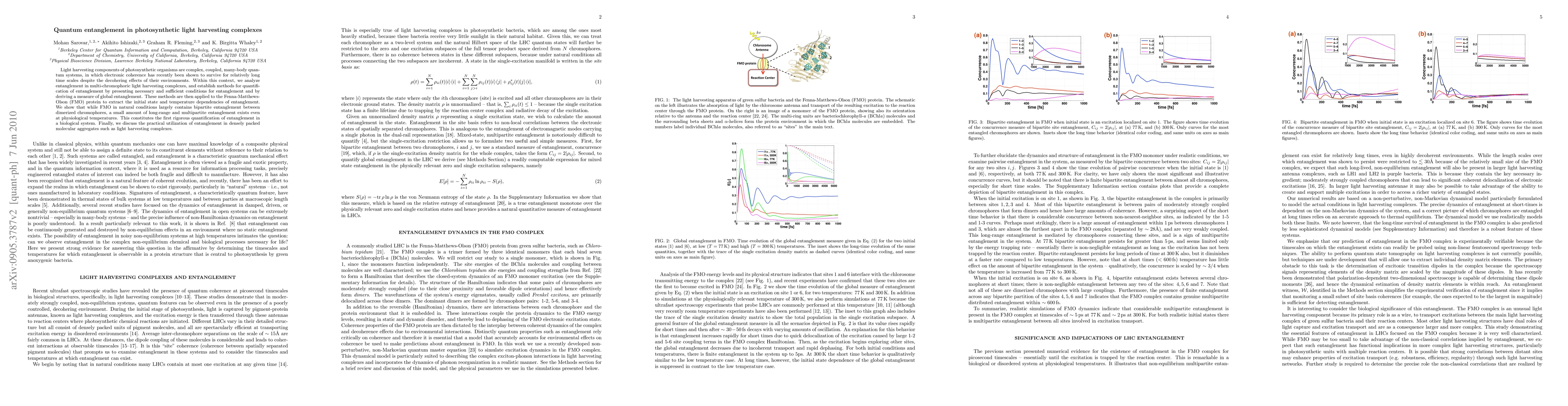 This paper investigates quantum entanglement in photosynthetic light harvesting complexes, establishing methods for quantifying entanglement and applying these to the FMO protein. It finds that while entanglement is mostly bipartite, there is also a small amount of long-range and multipartite entanglement at physiological temperatures, marking the first rigorous quantification of entanglement in a biological system.