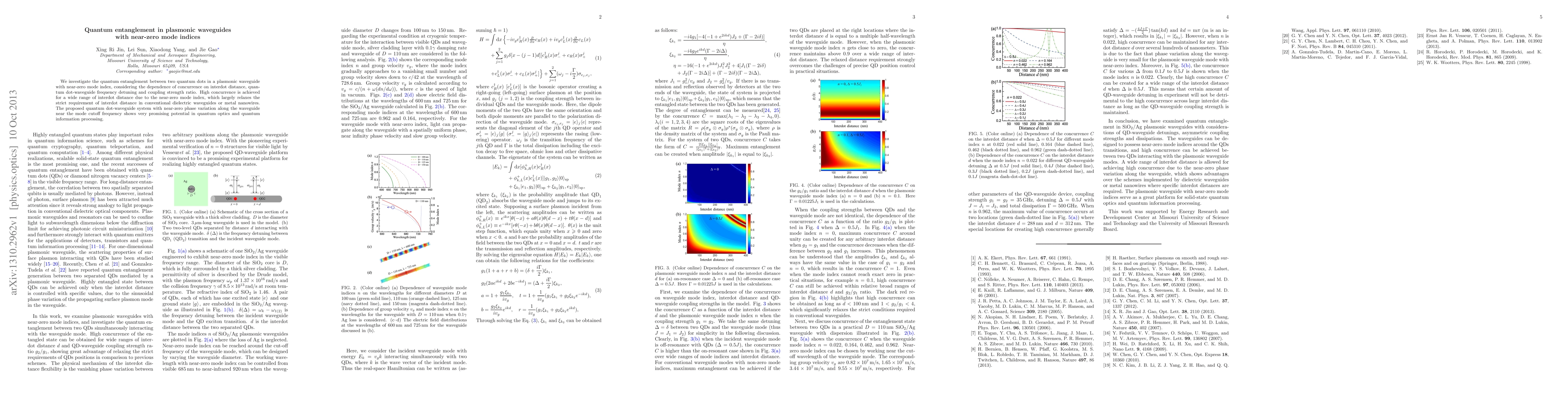 This study explores quantum entanglement in plasmonic waveguides with near-zero mode indices, demonstrating high concurrence between quantum dots over a wide interdot distance range. The near-zero mode index significantly reduces the stringent distance requirements typical in conventional waveguides, indicating strong potential for quantum optics and information processing.