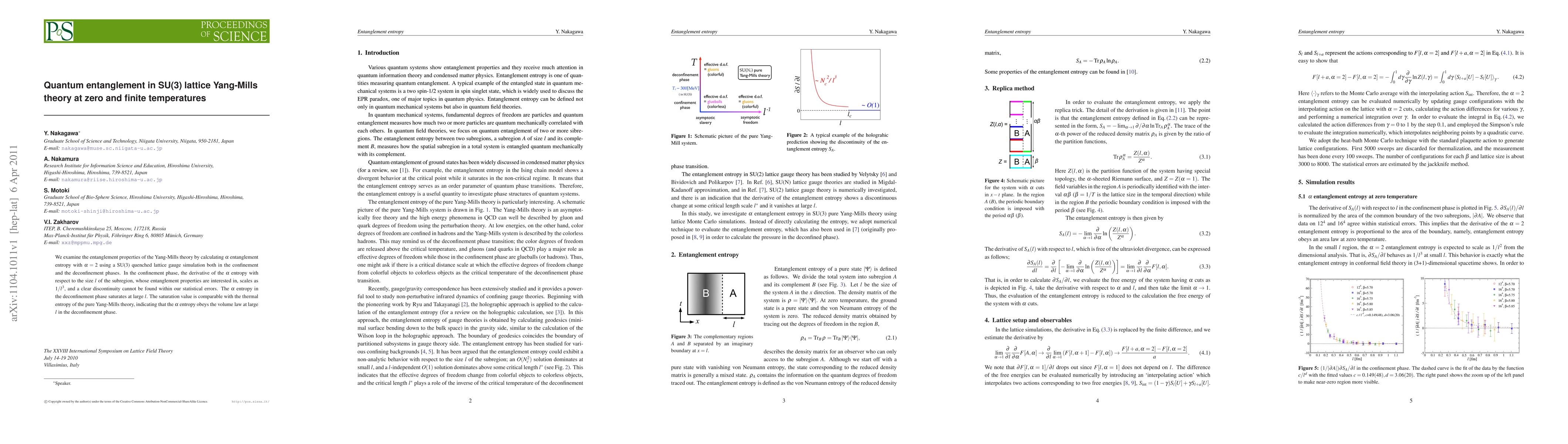 This research paper investigates entanglement properties in SU(3) lattice Yang-Mills theory at zero and finite temperatures, finding that the entropy scales with volume in the deconfinement phase.