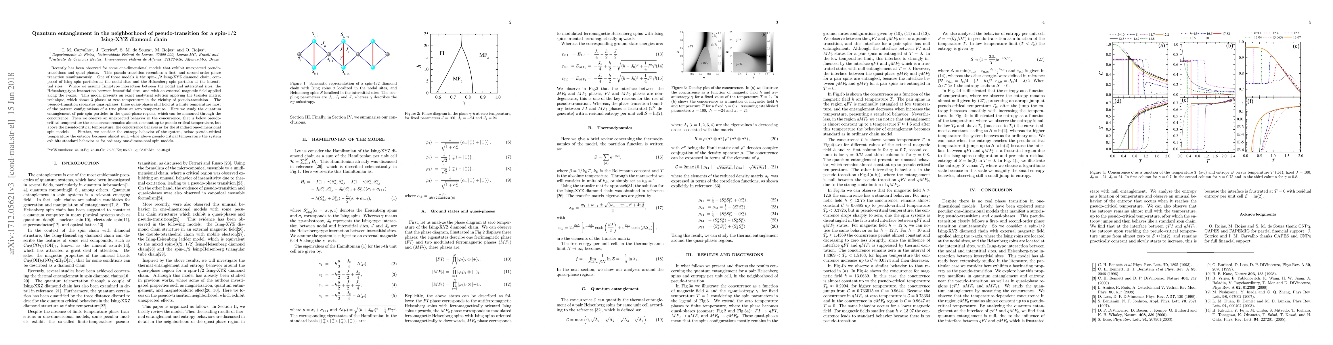 Recently has been observed for some one-dimensional models that exhibit unexpected pseudo-transitions and quasi-phases. This pseudo-transition resembles a first- and second-order phase transition simultaneously. One of those models is the spin-1/2 Ising-XYZ diamond chain, composed of Ising spin particles at the nodal sites and the Heisenberg spin particles at the interstitial sites. Where we assume Ising-type interaction between the nodal and interstitial sites, the Heisenberg-type interaction between interstitial sites, and with an external magnetic field applied along the z-axis. This model presents an exact analytical solution applying the transfer matrix technique, which shows 3 phases at zero temperature in the vicinity of pseudo-transition. The pseudo-transition separates quasi-phases, these quasi-phases still hold at a finite temperature most of the pattern configurations of a true phase at zero temperature. Here we study the quantum entanglement of pair spin particles in the quasi-phase regions, which can be measured through the concurrence. Then we observe an unexpected behavior in the concurrence, that is below pseudo-critical temperature the concurrence remains almost constant up to pseudo-critical temperature, but above the pseudo-critical temperature, the concurrence behaves as for the standard one-dimensional spin models. Further, we consider the entropy behavior of the system, below pseudo-critical temperature the entropy becomes almost null, while above pseudo-critical temperature the system exhibits standard behavior as for ordinary one-dimensional spin models.