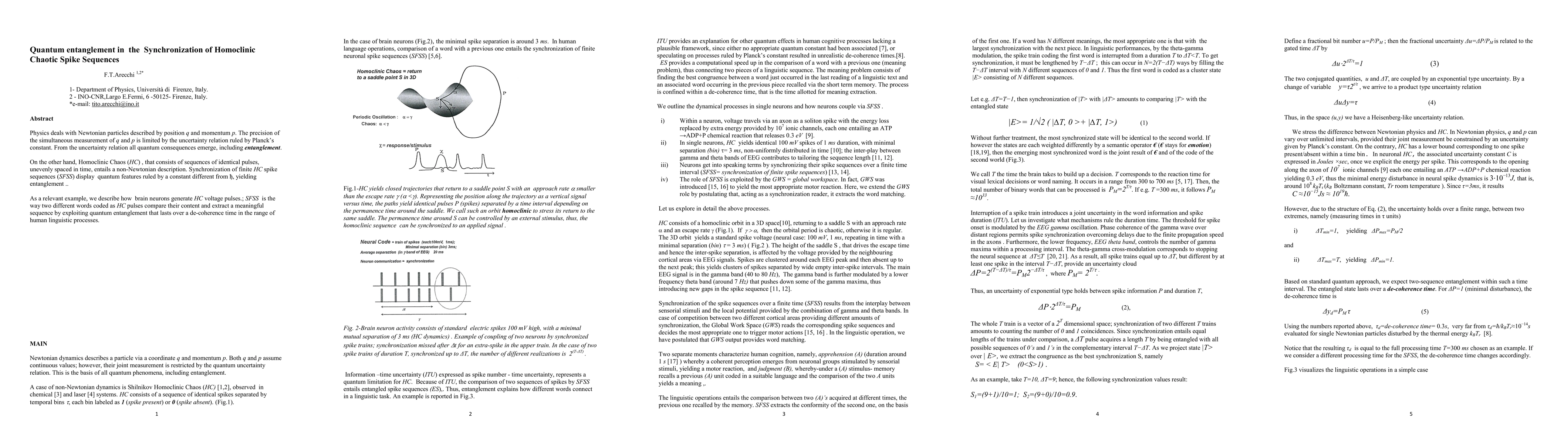 Physics deals with Newtonian particles described by position q and momentum p. The precision of the simultaneous measurement of q and p is limited by the uncertainty relation ruled by Planck's constant. From the uncertainty relation all quantum consequences emerge, including entanglement. On the other hand, Homoclinic Chaos (HC) , that consists of sequences of identical pulses, unevenly spaced in time, entails a non-Newtonian description. Synchronization of finite HC spike sequences (SFSS) display quantum features ruled by a constant different from hbar, yielding entanglement. As a relevant example, we describe how brain neurons generate HC voltage pulses. SFSS is the way two different words coded as HC pulses compare their content and extract a meaningful sequence by exploiting quantum entanglement that lasts over a de-coherence time in the range of human linguistic processes.