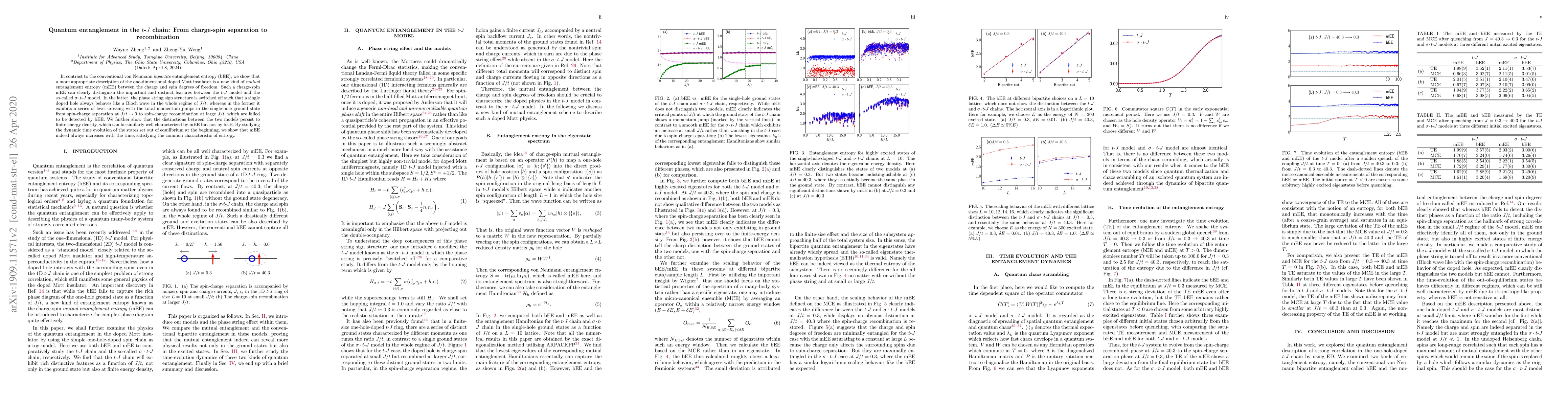 This paper introduces a new mutual entanglement entropy (mEE) to describe the entanglement between charge and spin in the t-J chain, distinguishing it from conventional bipartite entanglement entropy (bEE). It reveals that mEE captures the transition from charge-spin separation to recombination in the t-J model, a feature not detectable by bEE.