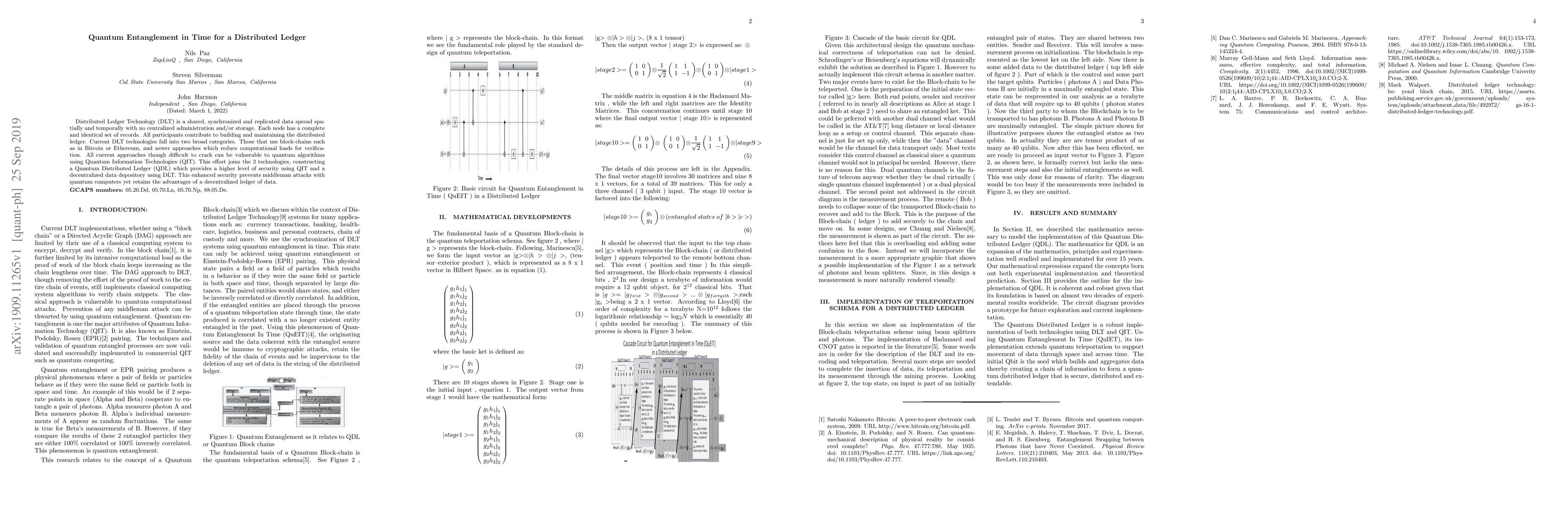 Distributed Ledger Technology (DLT) is a shared, synchronized and replicated data spread spatially and temporally with no centralized administration and/or storage. Each node has a complete and identical set of records. All participants contribute to building and maintaining the distributed ledger. Current DLT technologies fall into two broad categories. Those that use block-chains such as in Bitcoin or Ethereum, and newer approaches which reduce computational loads for verification. All current approaches though difficult to crack can be vulnerable to quantum algorithms using Quantum Information Technologies (QIT). This effort joins the 2 technologies, constructing a Quantum Distributed Ledger (QDL) which provides a higher level of security using QIT and a decentralized data depository using DLT. This enhanced security prevents middleman attacks with quantum computers yet retains the advantages of a decentralized ledger of data.