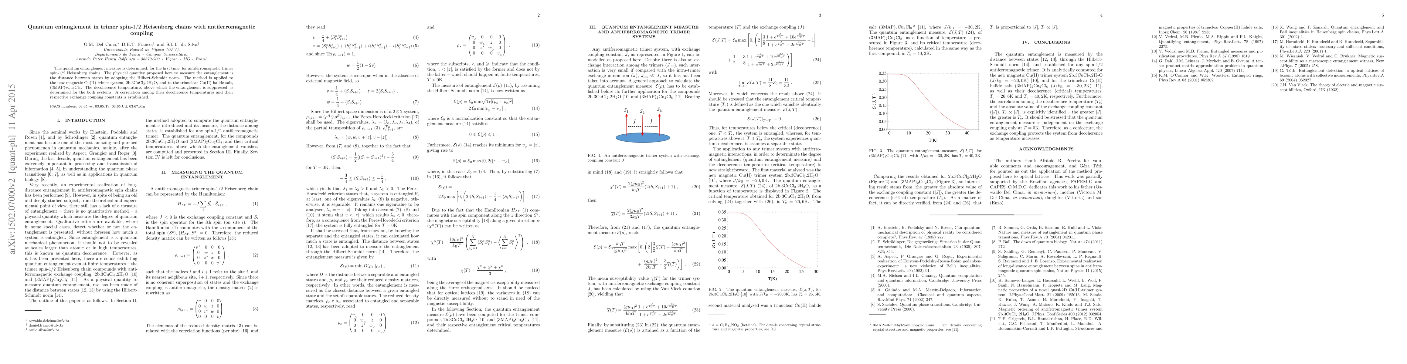 The quantum entanglement measure is determined, for the first time, for antiferromagnetic trimer spin-1/2 Heisenberg chains. The physical quantity proposed to measure the entanglement is the distance between states by adopting the Hilbert-Schmidt norm. The method is applied to the new magnetic Cu(II) trimer system, 2b.3CuCl_2.2H_2O, and to the trinuclear Cu(II) halide salt, (3MAP)_2Cu_2Cl_8. The decoherence temperature, above which the entanglement is suppressed, is determined for the both systems. A correlation among their decoherence temperatures and their respective exchange coupling constants is established.