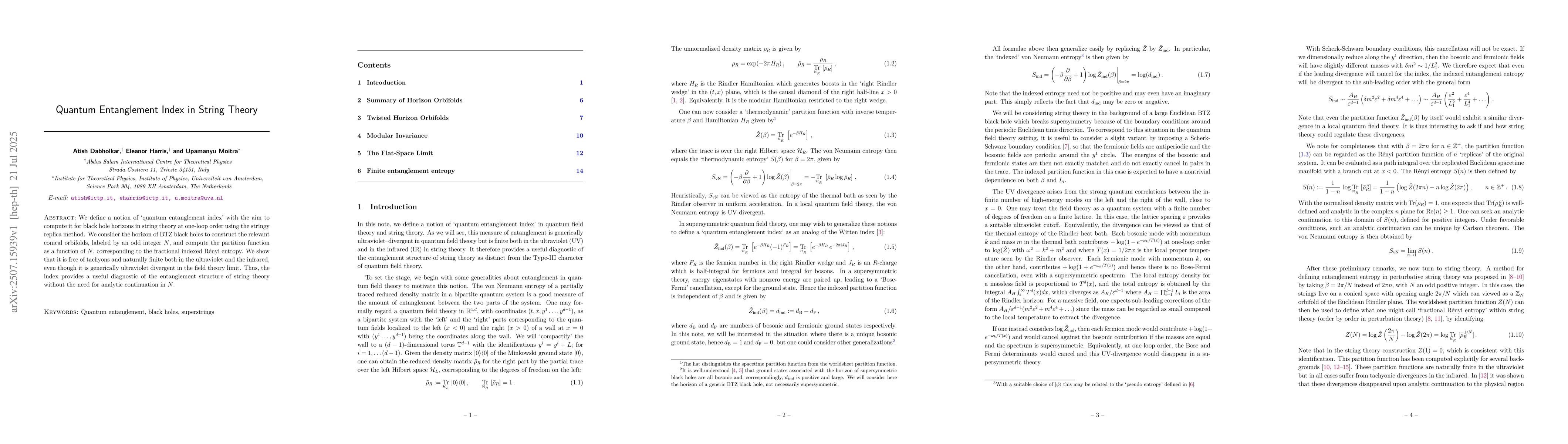 We define a notion of `quantum entanglement index' with the aim to compute it for black hole horizons in string theory at one-loop order using the stringy replica method. We consider the horizon of BTZ black holes to construct the relevant conical orbifolds, labeled by an odd integer $N$, and compute the partition function as a function of $N$, corresponding to the fractional indexed R\'enyi entropy. We show that it is free of tachyons and naturally finite both in the ultraviolet and the infrared, even though it is generically ultraviolet divergent in the field theory limit. Thus, the index provides a useful diagnostic of the entanglement structure of string theory without the need for analytic continuation in $N$.