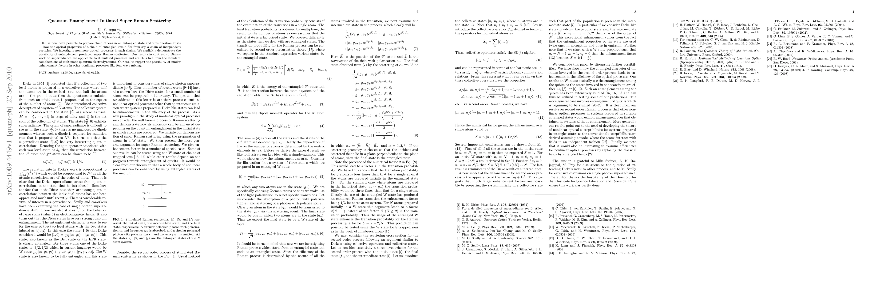 This research demonstrates the creation of entangled ion chains and the occurrence of entanglement-induced super Raman scattering, distinguishing it from Dicke's superradiance work. The findings suggest potential for enhanced factors in other nonlinear processes like four-wave mixing.
