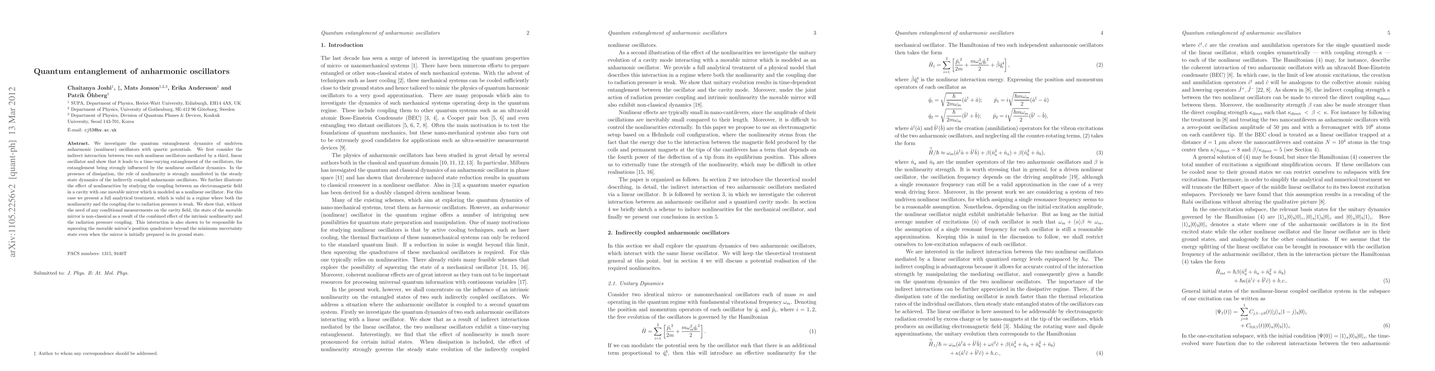 This paper explores the quantum entanglement dynamics of anharmonic oscillators with quartic potentials, focusing on indirect interactions mediated by a linear oscillator. It reveals that nonlinearity significantly influences entanglement and steady-state dynamics, especially in the presence of dissipation, and demonstrates these effects through a cavity with a movable mirror modeled as a nonlinear oscillator, showing non-classical states and squeezing.
