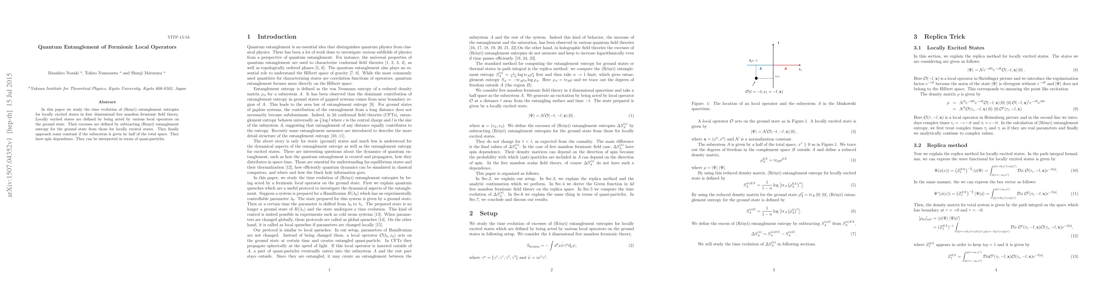 In this paper we study the time evolution of (Renyi) entanglement entropies for locally excited states in four dimensional free massless fermionic field theory. Locally excited states are defined by being acted by various local operators on the ground state. Their excesses are defined by subtracting (Renyi) entanglement entropy for the ground state from those for locally excited states. They finally approach some constant if the subsystem is given by half of the total space. They have spin dependence. They can be interpreted in terms of quasi-particles.