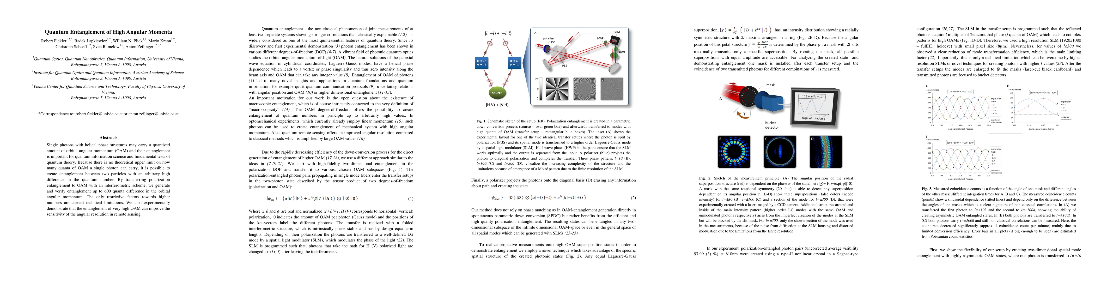 This paper demonstrates the generation and verification of quantum entanglement between photons with a high difference in orbital angular momentum (OAM) up to 600 quanta, using an interferometric scheme to transfer polarization entanglement to OAM. The study highlights the potential of such high OAM entanglement to enhance the sensitivity of angular resolution in remote sensing applications.