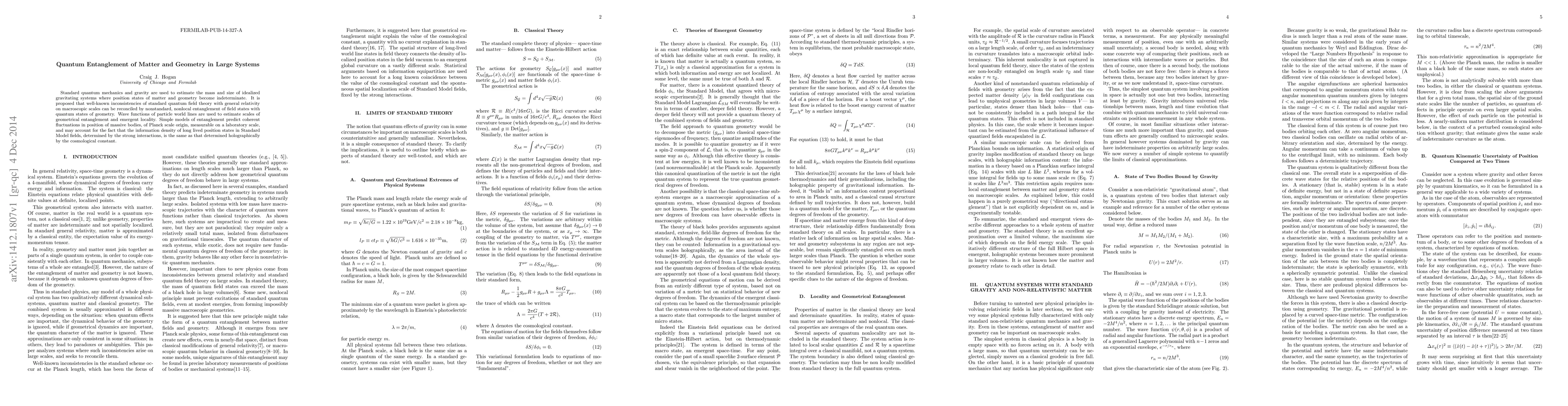 Standard quantum mechanics and gravity are used to estimate the mass and size of idealized gravitating systems where position states of matter and geometry become indeterminate. It is proposed that well-known inconsistencies of standard quantum field theory with general relativity on macroscopic scales can be reconciled by nonstandard, nonlocal entanglement of field states with quantum states of geometry. Wave functions of particle world lines are used to estimate scales of geometrical entanglement and emergent locality. Simple models of entanglement predict coherent fluctuations in position of massive bodies, of Planck scale origin, measurable on a laboratory scale, and may account for the fact that the information density of long lived position states in Standard Model fields, which is determined by the strong interactions, is the same as that determined holographically by the cosmological constant.
